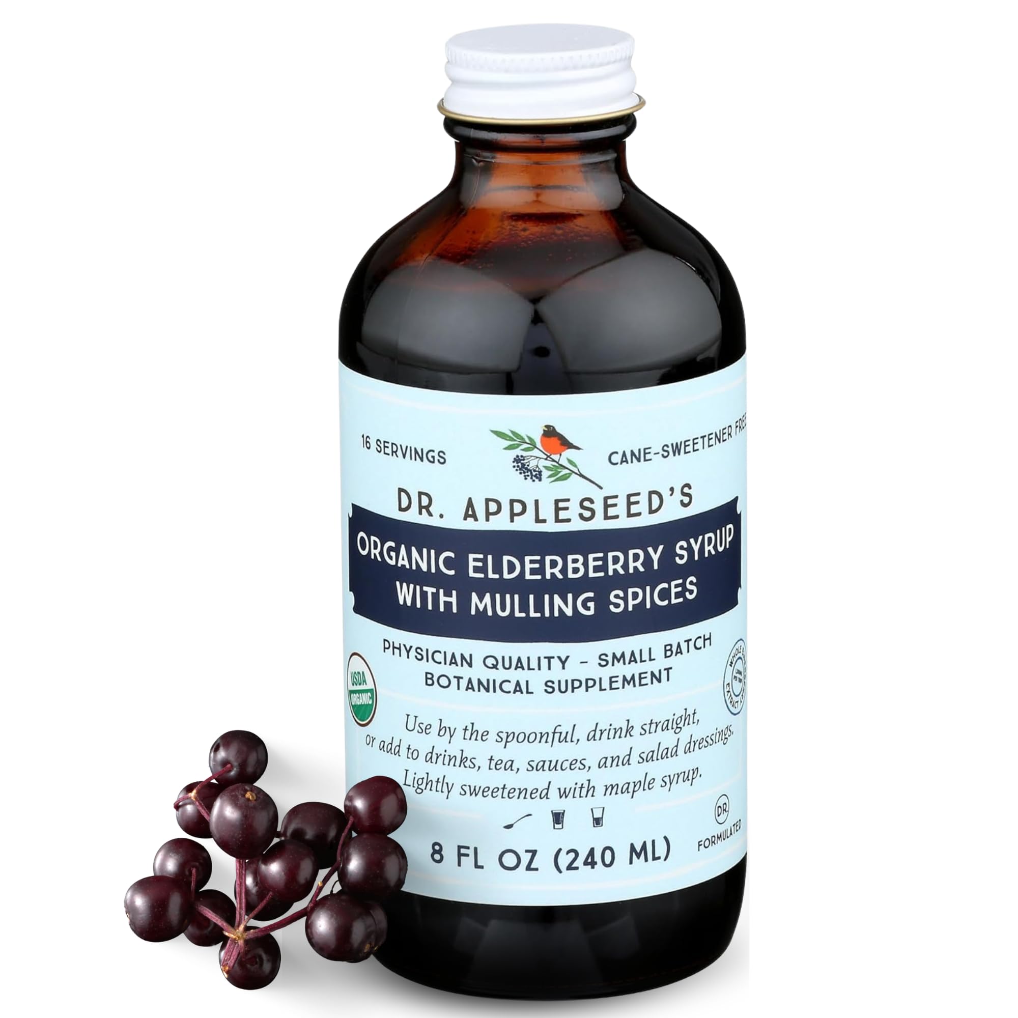FOR KIDS AND ADULTS - Dr. Appleseed's Organic Elderberry Syrup is formulated for all ages. Children aged 2-4 years can take ½ teaspoon 1-3 times daily, those aged 5 years can take 1 teaspoon 1-3 times daily, and kids and adults over 75 lbs can take 1 teaspoon to 1 tablespoon 1-3 times daily. This herbal wellness product offers easy-to-follow dosing for the entire family. Please use as directed. FRESH PURE - Unlike other brands, we use only fresh, hand-harvested elderberries from small farms within the United States. We avoid powdered, imported, dried, or hard-to-identify elderberries to maintain the highest quality standards in our elderberry health supplement. QUALITY YOU CAN TRUST - Our elderberry syrup is meticulously crafted to ensure purity and quality. It's USDA Certified Organic, vegan, and paleo-friendly, with no gluten, alcohol, sugar, or glycerin. Only a handful of people handle our products, ensuring you receive the best in organic wellness. POWERFUL ANTIOXIDANTS - Each serving of this elderberry concentrate is packed with antioxidant-rich black elderberries, providing robust immune-boosting properties and overall health benefits. With a 48 day supply per bottle, it's a convenient and effective way to support holistic health. IMMUNE SUPPORT - Boost your body's natural defenses with Dr. Appleseed's Organic Elderberry Syrup. This science-backed wellness product offers potent elderberry benefits for immune system support, making it a great addition to your daily routine. Lightly sweetened with maple syrup, it can be taken by the spoonful, straight, or added to drinks, teas, sauces, and salad dressings. Its delicious mulled spice flavor makes it kid and adult-friendly, perfect for anyone who loves the taste of mulled cider.