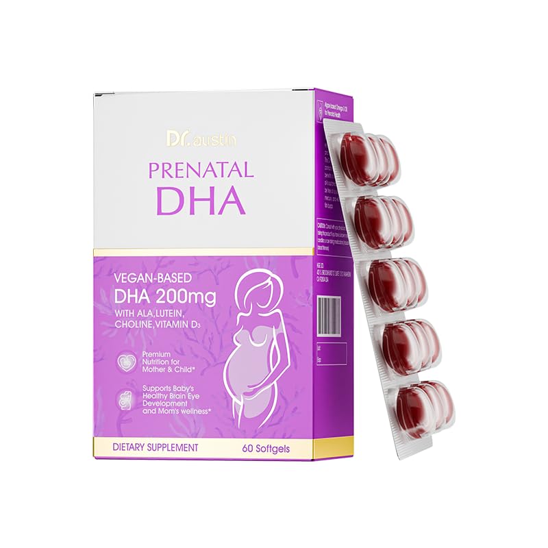Give your baby the best start with DR.austin Prenatal DHA, the ultimate brain and vision support for expecting and breastfeeding moms. Our Triple A Formula (DHA ARA ALA) is inspired by Cambridge research and NASA-grade algae oil technology, delivering 3x faster brain development for your little one while protecting your memory, mood, and immunity. With added EyeBrainX4 technology (DHA, ARA, ALA, Lutein), this supplement filters digital blue light and fuels retinal health for sharper vision. Trusted by moms worldwide and validated by 50 clinical studies, it's the smart choice for science-backed prenatal care. Key Benefits Supports baby's brain, vision, and nervous system development. Reduces pregnancy anxiety and postpartum depression risks. Enhances breast milk quality and maternal immunity. Usage Instructions Take 1 softgel daily with a meal. Suitable for preconception, pregnancy, and lactation stages. Safety Quality 100 plant-based algae oil (no fish, mercury, or gluten). Non-GMO, vegan-friendly, and rigorously tested for purity. Note Consult your healthcare provider before use if you have medical conditions. Store in a cool, dry place away from direct sunlight. Customer Promise Contact us for refunds or questions. Disclaimer These statements have not been evaluated by the FDA. This product is not intended to diagnose, treat, cure, or prevent any disease.