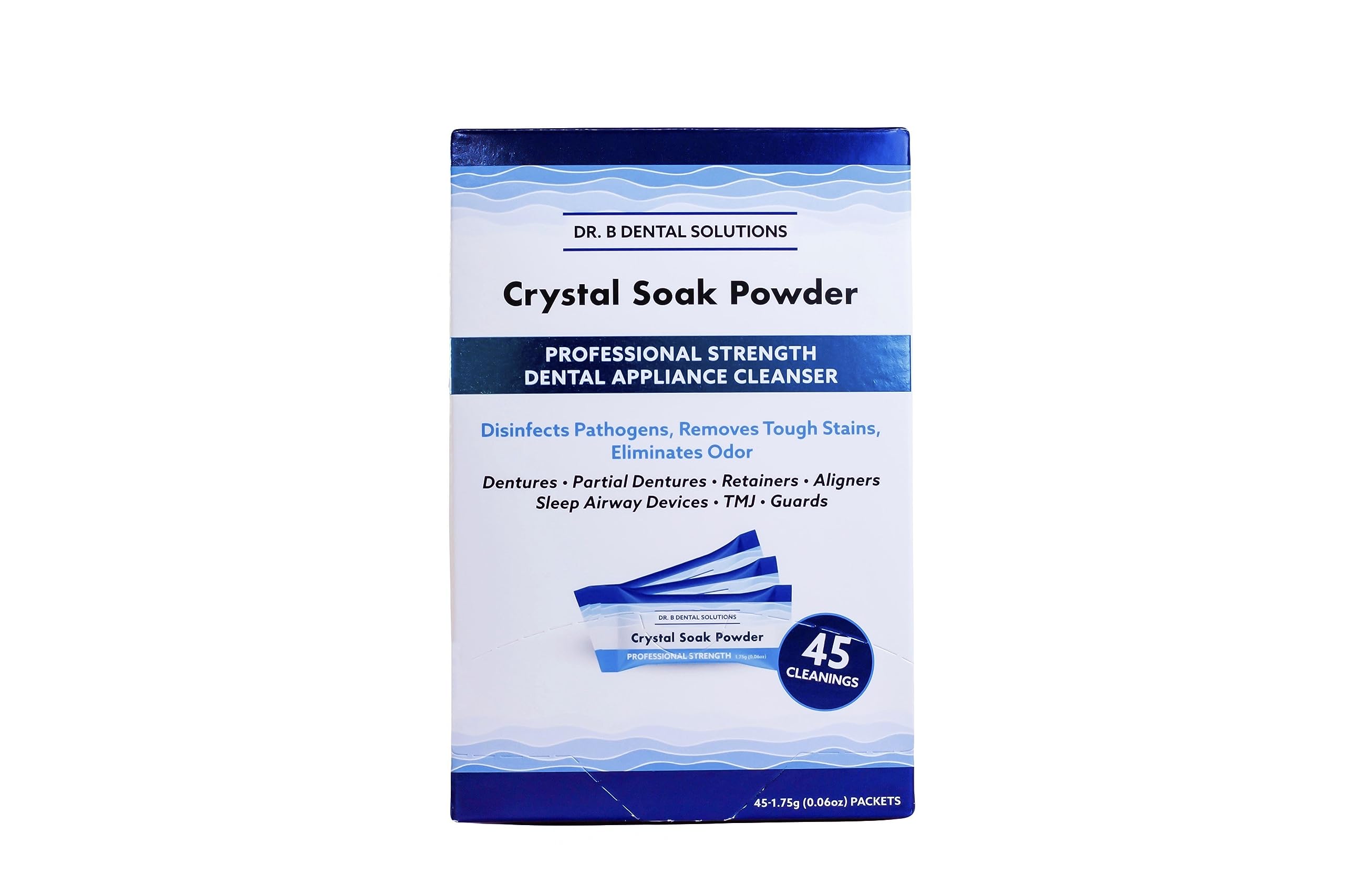 Optimized Cleaning Combo - Maximize cleaning results by pairing the Powder Crystal Soak Cleanser with Dr.B's Ultrasonic Cleaner. This expert-recommended blend guarantees supremely clean dental appliances, enhancing your oral health and hygiene. Promotes Oral Health - Providing the same trusted clean as our liquid form, but in a more travel-friendly powder pack. Revolutionary Quick-Action Formula - In mere minutes, witness a transformation as our cleanser banishes debris and stains. It detoxifies dentures, retainers, aligners, night guards and sleep apnea devices, leaving them residue-free and like-new. Deep Cleanse with No Harsh Chemicals - Our formula eliminates odors, stains, and debris without bleach, alcohol, peroxide, chlorine or any other harmful substances. Convenient and Portable - Our Powder Crystal Soak Cleanser comes in 45 handy packets, perfect for cleaning on-the-go. Don't worry about TSA restrictions when traveling, this product is fully compliant and fits comfortably in your bag.