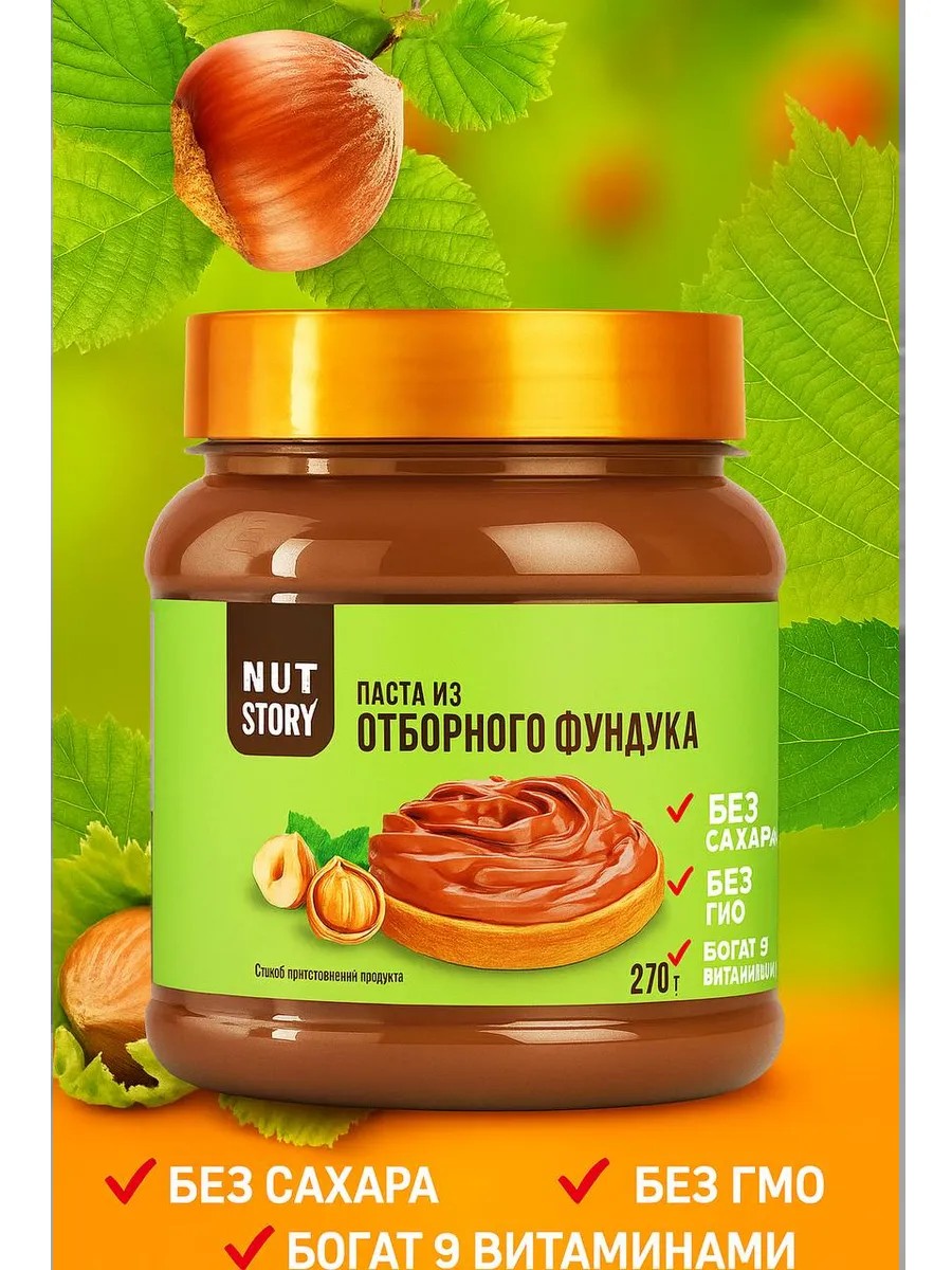 Ореховая паста из фундука 270г без сахара и масла — это натуральный продукт, созданный только из отборных ядер фундука, без добавления сахара, соли, пальмового масла и консервантов. Никаких лишних ингредиентов — только 100% орех, бережно измельчённый до однородной и нежной текстуры.