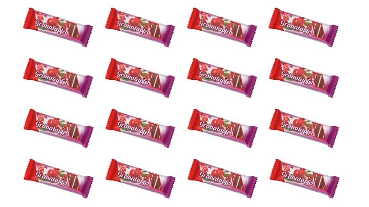 Ingredients: Apple powder, glucose syrup, wheat flakes, 9 pomegranate juice (equivalent to 47 pomegranate juice), dried wine berries, sugar, almonds, honey, sunflower oil, edible paper (wheat flour, potato starch), aronia juice concentrate, invert sugar syrup, acid: citric acid, natural flavoring, salt. INGREDIENTS Apple powder, glucose syrup, wheat flakes, 9 pomegranate juice (equivalent to 47 pomegranate juice), dried wine berries, sugar, almonds, honey, sunflower oil, edible paper (wheat flour, potato starch), aronia juice concentrate, invert sugar syrup, acid: citric acid, natural flavoring, salt.