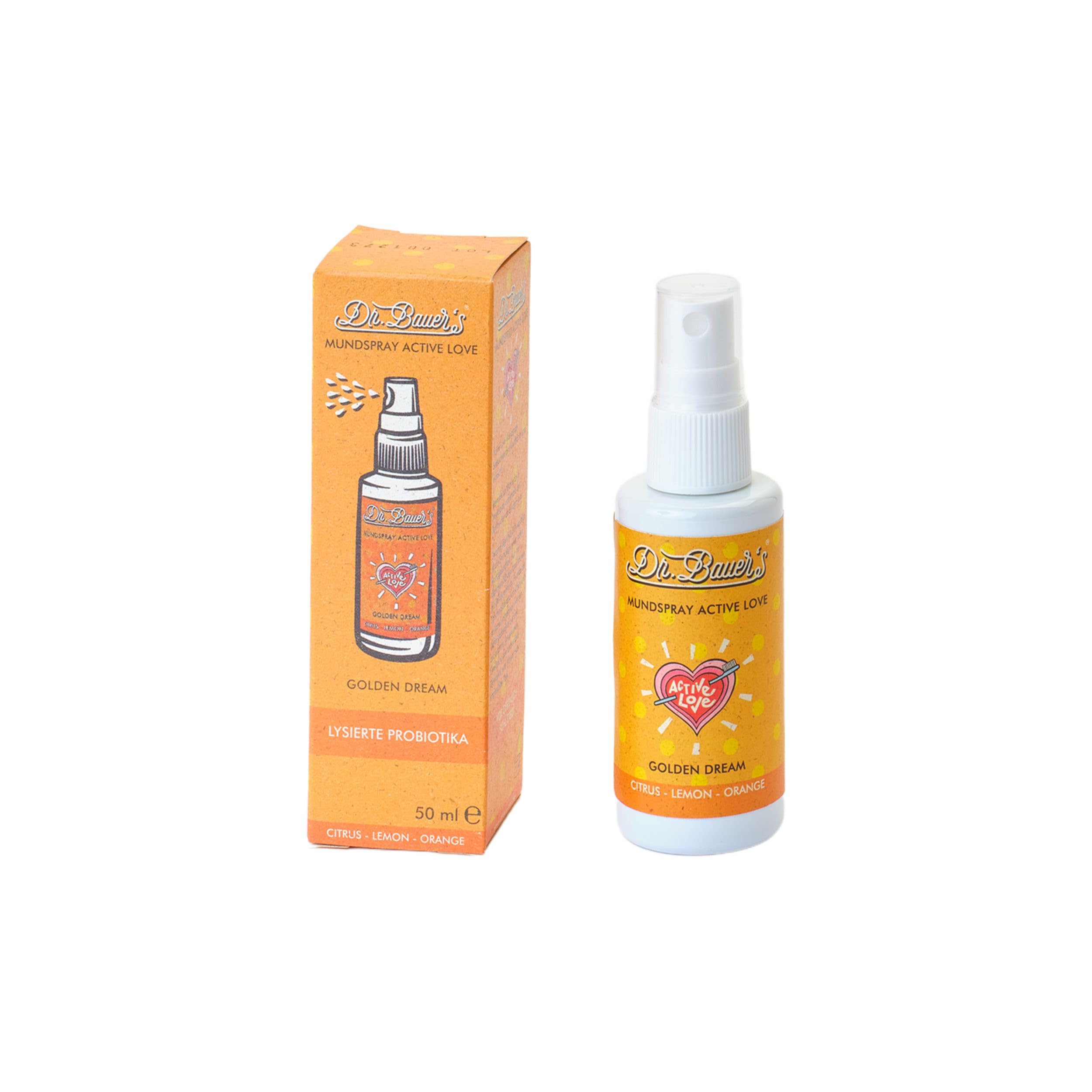 Discover a new kind of oral hygiene with Dr. Bauer's mouth sprays – designed for those who appreciate fresh breath, pleasant aromas, and natural ingredients. The four lovingly crafted varieties offer a sensory experience that enriches your everyday life, from powerful mint to gentle herbs and sweet, fruity notes. Whether at the office, after a meal, before a date, or on the go, a single spray is all it takes to freshen your breath and leave your mouth feeling clean. Thanks to their alcohol-free formula, the sprays are especially gentle and suitable for sensitive individuals. The recipes are based on premium plant-based ingredients and are, of course, 100 vegan. The sustainable packaging, featuring a sugarcane bottle body, makes Dr. Bauer's mouth spray not only a sensory experience but also a conscious choice for the environment. Find your favorite flavor: intense, mild, lemony, or fruity—Dr. Bauer's oral care becomes a moment of pleasure. DIRECTIONS FOR USE Put an appropriate amount of mouth spray into your mouth. Swish around your mouth for about 30 seconds, then spit it out. Avoid swallowing. For best results, use the mouth spray twice a day, morning and evening, or as directed by a dentist. SAFETY WARNING Do not swallow. Avoid contact with eyes. See moreEnvironmentally friendly packaging: bottle made from renewable raw materials (sugarcane base), manufactured in Germany. Vegan and plant-based: free from animal-derived ingredients, microplastics, or unnecessary additives. Ideal for children and sensitive individuals: gentle freshness without harshness or burning sensation. Menthol-free and alcohol-free: particularly well-tolerated by sensitive gums and those sensitive to menthol. Smooth, fruity freshness with a hint of peach: gentle herbs and peach combined for a pleasant mouthfeel.Dr. Bauer's Golden Dream Spray buccal - Fraîcheur d'agrumes au citron et orange - Sans alcool, végétalien et doux - Rafraîchit l'haleine et la bouche - 50 ml Golden Dream 50 ml (1er Pack)DESCRIPTION DU PRODUIT DESCRIPTION DU PRODUIT Découvrez le nouveau type d'hygiène bucco-dentaire avec les sprays buccaux Dr. Bauer's – Conçu pour ceux qui apprécient l'haleine fraîche, les arômes agréables et les ingrédients naturels. Les quatre variétés composées avec amour vous offrent une expérience sensorielle qui enrichit votre vie quotidienne, de la menthe puissante aux herbes douces en passant par les notes fruitées et douces. Que ce soit au bureau, après le repas, avant un rendez-vous ou en déplacement, une pulvérisation suffit pour rafraîchir votre haleine et laisser une sensation soignée dans la bouche. Grâce à leur formulation sans alcool, les sprays sont particulièrement doux et conviennent également aux personnes sensibles. Les recettes sont à base d'ingrédients végétaux de qualité supérieure et sont bien sûr 100 végétaliennes. L'emballage durable avec un corps de bouteille en canne à sucre fait du spray buccal Dr. Bauer's non seulement une expérience pour les sens, mais aussi un choix conscient pour l'environnement. Trouvez votre goût préféré : intense, doux, citronné ou fruité, les soins buccaux Dr. Bauer's deviennent un moment de plaisir. MODE D'EMPLOI Mettez une quantité appropriée de spray buccal dans votre bouche. Tournez autour de la bouche pendant environ 30 secondes, puis crachez-le. Évitez de l'avaler. Pour des résultats optimaux, utilisez le spray buccal deux fois par jour, matin et soir, ou selon les instructions d'un dentiste. AVERTISSEMENT DE SÉCURITÉ Ne pas avaler. Évitez tout contact avec les yeux. Voir plusEmballage respectueux de l'environnement : bouteille fabriquée à partir de matières premières renouvelables (base de canne à sucre), fabriquée en Allemagne. Végétalien et à base de plantes : sans ingrédients d'origine animale, microplastique ou additifs inutiles. Idéal pour les enfants et les personnes sensibles : fraîcheur discrète sans tranchant ni brûlure. Sans menthol et sans alcool : particulièrement bien toléré par les gencives sensibles et pour les personnes sensibles au menthol. Fraîcheur douce et fruitée avec une touche de pêche : herbes douces et pêche combinées pour une sensation agréable en bouche.