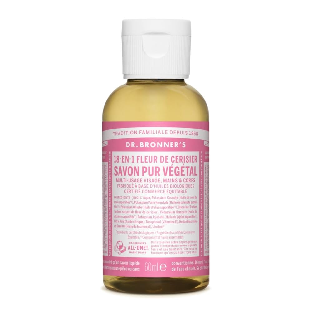 Our Pure Castile soaps are 2 to 3 times more concentrated than conventional cleaners and are multi-purpose! Simplify your cupboard, replace several products with a single non-toxic cleaner – safe for the whole family! INGREDIENTS Aqua, Potassium Cocoate (Saponified Coconut Oil ‡), Potassium Palm Kernelate (Saponified Palm Kernelate Oil ‡), Potassium Olivate (Saponified Olive Oil ‡), Glycerin, Parfum (Natural Cherry Blossom Fragrance), Potassium Hempate (Saponified Hemp Oil ), Potassium Jojobate (Saponified Jojoba Oil ), Citric Acid, Tocopherol (Vitamin E), Helianthus Annuus Seed Oil (Sunflower Oil), Linalool?- Packaged in a 100 recycled plastic bottle. - Free from synthetic preservatives, detergents, and foaming agents. - Biodegradable, vegan, and cruelty-free. - Made with organic oils. - Economical effective.Savon liquide fleur de cerisier Dr Bronner's 60 mlDESCRIPTION DU PRODUIT DESCRIPTION DU PRODUIT Nos savons Pure Castille sont 2 à 3 fois plus concentrés que les nettoyants conventionnels et sont multi usages ! Simplifiez votre armoire, remplacez plusieurs produits par un seul nettoyant non toxique - sans danger pour toute la famille! INGRÉDIENTS Aqua, Potassium Cocoate (Huile de noix de coco saponifiée ‡), Potassium Palm Kernelate (Huile de palmiste saponifiée ‡), Potassium Olivate (Huile d'olive saponifiée ‡), Glycérine, Parfum (Arôme naturel de fleur de cerisier), Potassium Hempate (Huile de chanvre sapon ifiée ), Potassium Jojobate (Huile de jojoba saponifiée ), Citric Acid (Acide citrique), Tocopherol (Vitamine E), Helianthus Annuus Seed Oil (Huile de tournesol), Linalool?- Emballé dans une bouteille en plastique recyclé à 100 . - Sans conservateurs synthétiques, détergents ou agents moussants. - Biodégradable, végétalien et sans cruauté animale. - Fabriqué avec des huiles biologiques. - Economique efficace.