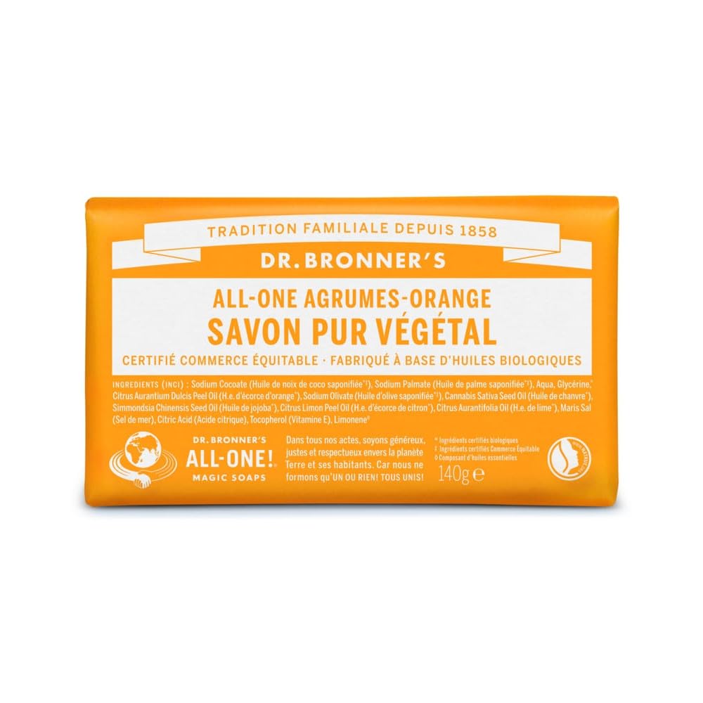 The quality of our liquid soaps in a bar! Effective, eco-friendly, versatile – vegan and cruelty-free. Fairtrade certified ingredients, made with organic oils, and free of synthetic materials. Biodegradable in 100 recycled packaging. INGREDIENTS Aqua, Potassium Cocoate (Saponified Coconut Oil ‡), Potassium Palm Kernelate (Saponified Palm Kernelate ‡), Potassium Olivate (Saponified Olive Oil ‡), Glycerin , Citrus Aurantium Dulcis Peel Oil (Orange Peel Oil ), Potassium Hempate (Saponified Hemp Oil ), Potassium Jojobate (Saponified Jojoba Oil ), Citrus Limon Peel Oil (Lemon Peel Oil ), Citrus Aurantifolia Oil (Lemon Oil ), Citric Acid, Tocopherol (Vitamin E), Limonene?, Citral?, Linalool? Certified Organic Ingredients ‡Certified Fair Trade Ingredients ?Components of Essential OilsItem packaging dimensions: 3.2 L x 5.5 W x 9.3 H cm. Item packaging weight: 0.13 kg. soap moisturizing soap face body hair dr bronner FACIAL CLEANSER dr bronners pure soap organic soap dr bronners soap citrus orange soap purifying soap soap for all skin types Dr Bronners Citrus-Orange Soap Bar body hair.Pain de savon agrumes-orange Dr Bronner's 140 gDESCRIPTION DU PRODUIT DESCRIPTION DU PRODUIT La qualité de nos savons liquides dans un pain ! Efficace, écologique, polyvalent - végétalien et sans cruauté animale. Ingrédients certifiés équitables, à base d'huiles biologiques, sans matières synthétiques. Biodégradable dans un emballage 100 recyclé. INGRÉDIENTS Aqua, Potassium Cocoate (huile de coco saponifiée ‡), Potassium Palm Kernelate (huile de palmiste saponifiée ‡), Potassium Olivate (huile d'olive saponifiée ‡), Glycerin , Citrus Aurantium Dulcis Peel Oil (huile d'écorces d'oranges ), Potassium Hempate (huile de chanvre saponifiée ), Potassium Jo jobate (huile de jojoba saponifiée ), Citrus Limon Peel Oil (huile d'écorces de citrons ), Citrus Aurantifolia Oil (huile de citron ), Citric Acid (acide citrique), Tocopherol (vitamine E), Limonene?, Citral?, Linalool? Ingrédients certifiés biologiques ‡ Ingrédients certifiés Commerce Équitable ? composants d'huiles essentiellesDimensions de l'emballage de l'article: 3.2 L x 5.5 L x 9.3 H cm. Poids de l'emballage de l'article: 0.13 kg. savon savon hydratant visage corps cheveux dr bronner NETTOYANT VISAGE dr bronners savon pur savon bio savon dr bronners savon agrumes orange savon purifiant savon tous types de peaux Pain de savon agrumes-orange Dr corps cheveux.