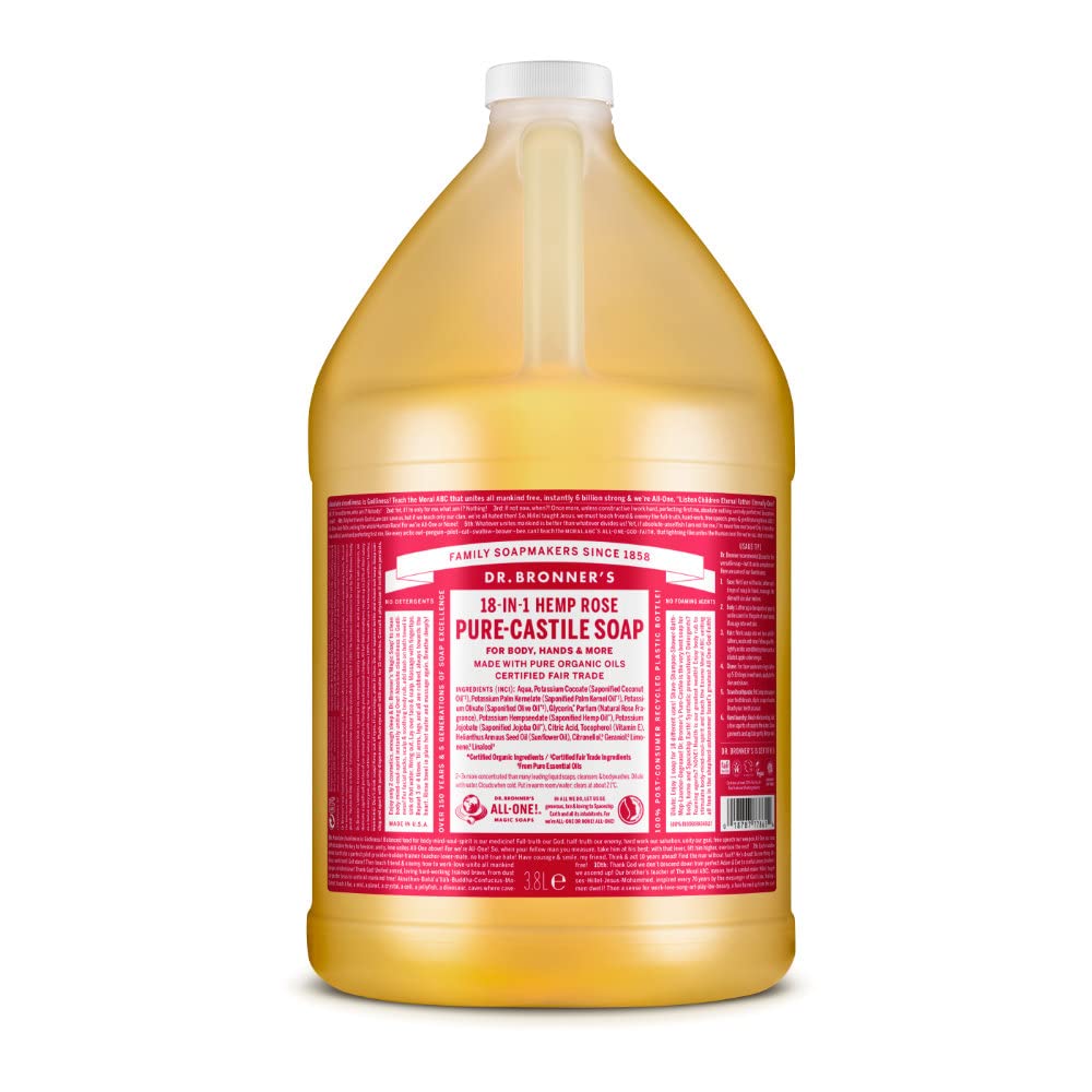 Dr. Bronner's pure-castile hemp rose soap is floral and fresh with a hint of sweetness. It is concentrated, biodegradable, versatile and effective. It is good for just about any cleaning task. Use it for body washing, dishes, laundry, mopping or pets. We also ensure that no animal testing is involved in our processes because we don't believe in simply creating a better product, but in creating a better planet. This product is certified organic, Non-GMO and cruelty free. Includes one 1 gallon bottle of Dr. Bronner's pure-castile hemp rose soap. Please review warning panel before use. Over 150 years and five generations of soap excellence.