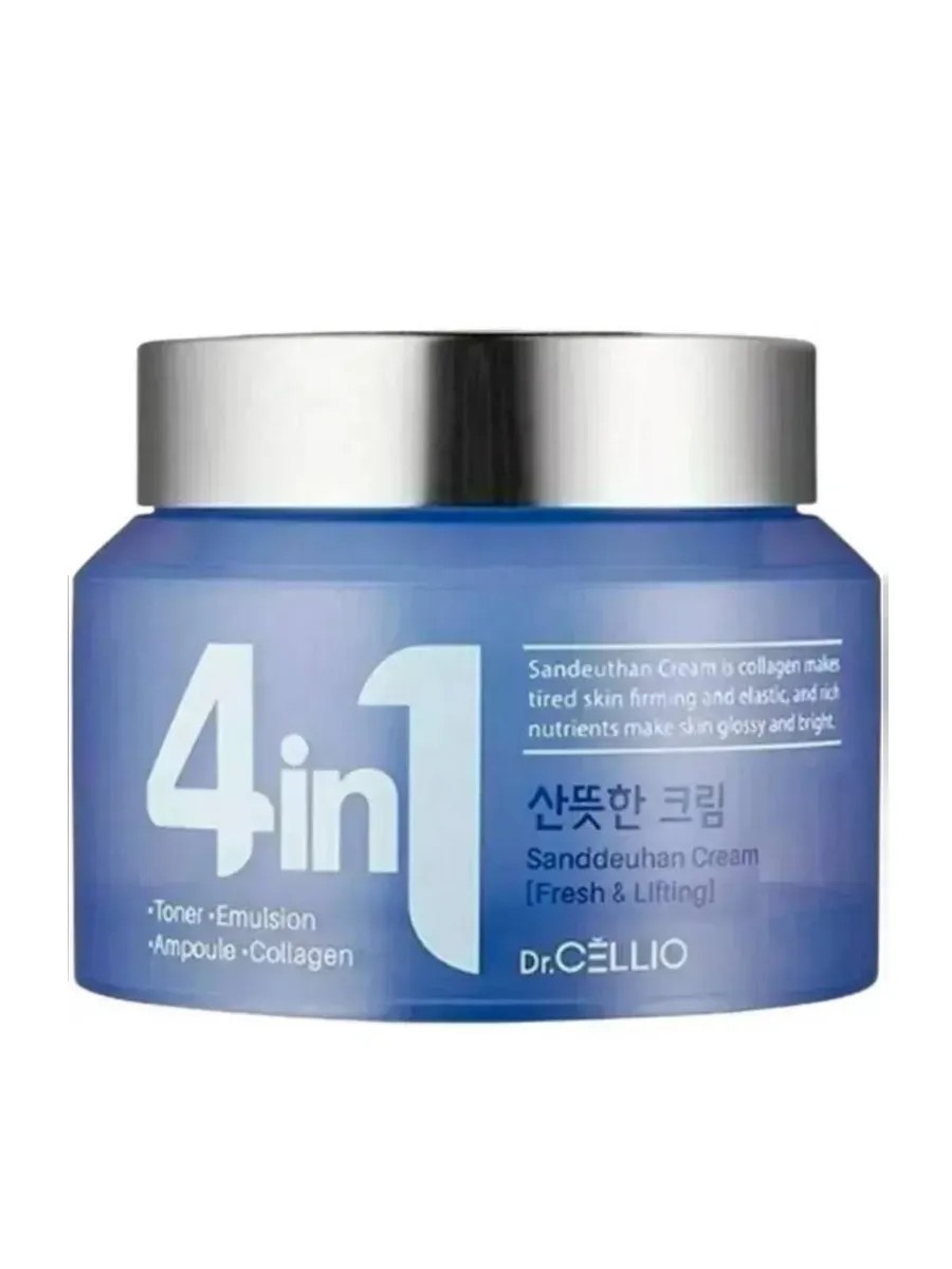 Dr.Cellio Dr.G50 4 In 1 Sanddeunhan Collagen Cream — это многофункциональный крем для лица, который объединяет в себе четыре средства: тонер, эмульсию, сыворотку и подтягивающий крем. Он содержит коллаген, который обеспечивает лифтинг-эффект, улучшает тонус кожи, разглаживает ее текстуру, делает упругой и сияющей. Крем помогает уменьшить глубину морщин, повысить эластичность и упругость кожи.