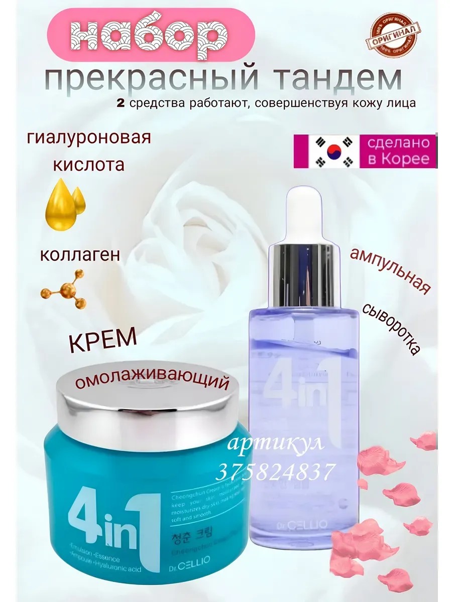 Комплекс из двух средств для ухода за кожей лица от корейского бренда 4в1. Крем и сыворотка обогащены гиалуроновой кислотой и коллагеном и представляют собой многофункциональное средство ухода,