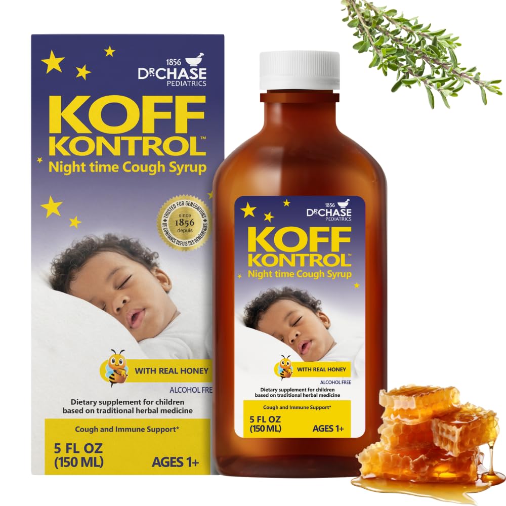 The Chase tradition of caring for children goes back to 1856, when the respected Dr. A.W. Chase cared for his patients and delivered over 3,000 healthy babies. Our kids cough relief syrup is easy to use. Ages 2-4, 7.5mL twice a day. Ages 5-9, 15mL twice a day. Ages 10-13, 25mL twice a day. Shake well before each use. Made with natural ingredients, is drug free and alcohol free, our toddler cough syrup uses the finest ingredients for an immune boosting wellness formula that helps your kiddo kick the koff. Koff' Kontrol's honey sweetened cough syrup is a dark amber liquid known for its cough-calming properties and encourages kids sore throat relief. Our toddler cough medicine is made with a blend of honey, elderberry, thyme and echinacea which combines immune support and encourages relief of common symptoms associated with seasonal irritants and bugs.