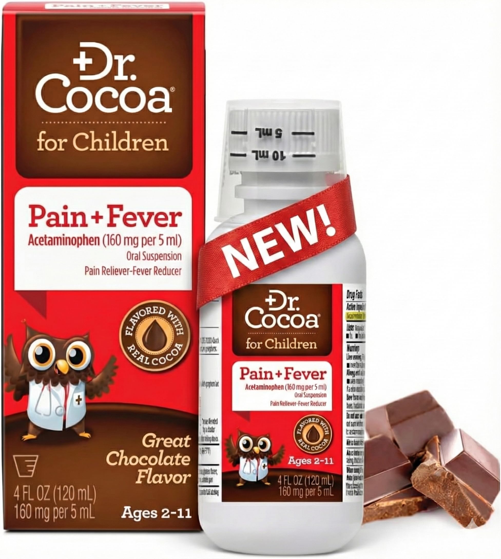 TRUSTED PAIN FEVER REDUCER FOR MULTIPLE CONDITIONS - 4 FL OZ (120mL) bottle provides reliable symptom relief for the common cold, flu, toothache, sore throat, and headache. Keep out of reach of children and follow all dosing directions carefully. Made by InFirst Healthcare for parents who want effective medicine their kids won't refuse. ACCURATE DOSING MADE SIMPLE WITH INCLUDED DOSING CUP - Comes with a specially designed dosing cup and clear age weight-based dosing chart. Easy-to-follow instructions help ensure proper dosage for children 24-95 lbs (2-11 years). Shake well before use and repeat every 4 hours while symptoms last - no more than 5 doses in 24 hours. CLEANER FORMULA WITHOUT UNWANTED INGREDIENTS - Free from high fructose corn syrup, synthetic dyes, and parabens. Compare to leading brands and see the difference - Dr. Cocoa provides the same effective 160mg per 5mL acetaminophen dosage but with a cleaner ingredient list parents can feel good about giving their children. FAST-ACTING RELIEF - Effectively reduces fever and relieves minor aches and pains from common cold, flu, sore throat, headache, and toothache. Trusted acetaminophen formula works quickly to help your child feel better faster so they can rest and recover comfortably. CHOCOLATE FLAVORED ACETAMINOPHEN KIDS ACTUALLY LOVE - Made with real cocoa, Dr. Cocoa for Children delivers 160mg acetaminophen per 5mL in a delicious chocolate taste that makes medicine time easier for parents and more enjoyable for kids ages 2-11. Compare to Children's Tylenol Oral Suspension active ingredient.