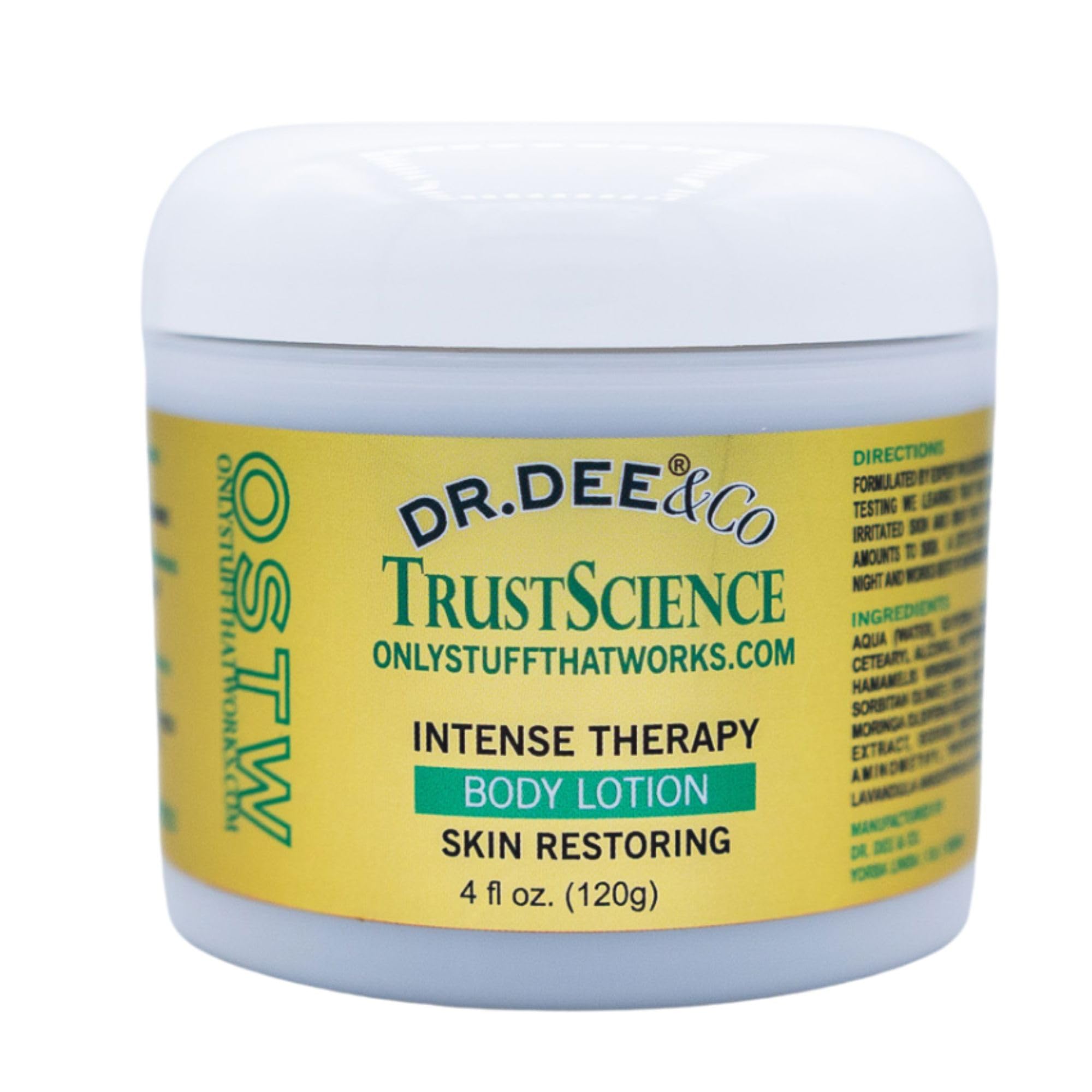 Say goodbye to itchy, dry skin days and hello to silky-smooth comfort with Dr. Dee Co.'s Intense Therapy Body Lotion! This no-nonsense, feel-good formula is made for sensitive skin that needs a little extra love—especially if it's dry, reactive, or just feeling off. Packed with skin-loving MicroSilver and calming aloe vera, it helps support your skin's natural barrier without the drama. No heavy scents, no greasy residue—just fast-absorbing, lightweight hydration that plays nice with even the most delicate skin. Use it daily to keep your skin soft, smooth, and oh-so-satisfied. When your skin needs a hug, this is the lotion to reach for.