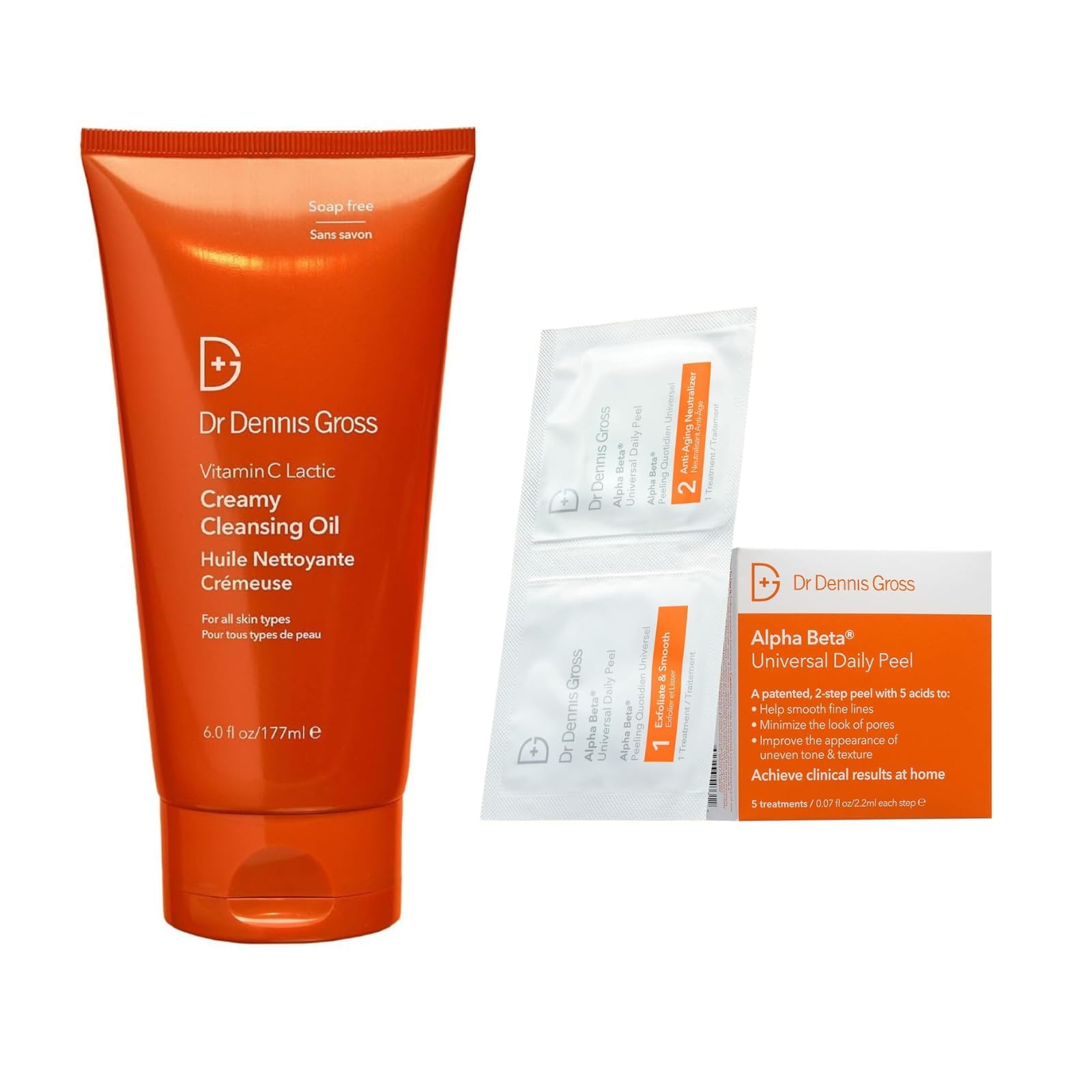A creamy oil-based cleanser that removes makeup, SPF impurities then transforms to rinse clean, no second-cleanse necessary! Formulated with 2 forms of Vitamin C, a 7 oil complex and colloidal oatmeal for clean, bright and hydrated skin. Universal Peel: Best for balanced combination skin, moderate signs of aging or blemish concerns - ideal for first time peelers. Step 1 gently but effectively exfoliates with 5 AHA BHAs to immediately boost radiance, target pores, diminish fine lines, and even out tone and texture while step 2 neutralizes while hydrating and delivering anti-aging actives for smooth, even, balanced skin.Dennis Gross, MD, is a board-certified dermatologist and dermatological surgeon who has been in practice for 25 years. He is well-known for his expertise in skin health as well as his approach to creating and maintaining the most natural-looking skin utilizing state-of-the-art cosmetic treatments and dermatologic technology. Dr. Dennis Gross is a regular guest on shows including Dr. OZ, The Today Show, The Doctors, CBS: The Early Show, and CNN. 2 minutes to smooth, beautiful skin. Experience immediate radiance and see beautifully transformed skin: your pores look smaller, lines fade, and your skin looks more even and balanced. Universal Daily Peel (5 Treatments): A fast-acting, two-step daily treatment for clinical results at home. Our effective dose of 5 AHA BHAs plus antioxidants and vitamins lift away dead skin along with excess oil impurities while improving uneven tone texture. Ultra nourishing and packed with potent ingredients such as two forms of Vitamin C, and lactic acid this multi-action cleanser. Ingredients like green tea, apricot, sunflower oil and colloidal oatmeal deeply soothe and hydrate to always leave your skin in balance. Vitamin C Creamy Cleansing Oil: A luxurious creamy oil cleanser that grips and breaks down makeup, SPF and impurities and changes with water to lather, leaving the skin clean and refreshed, no second-cleanse necessary!.