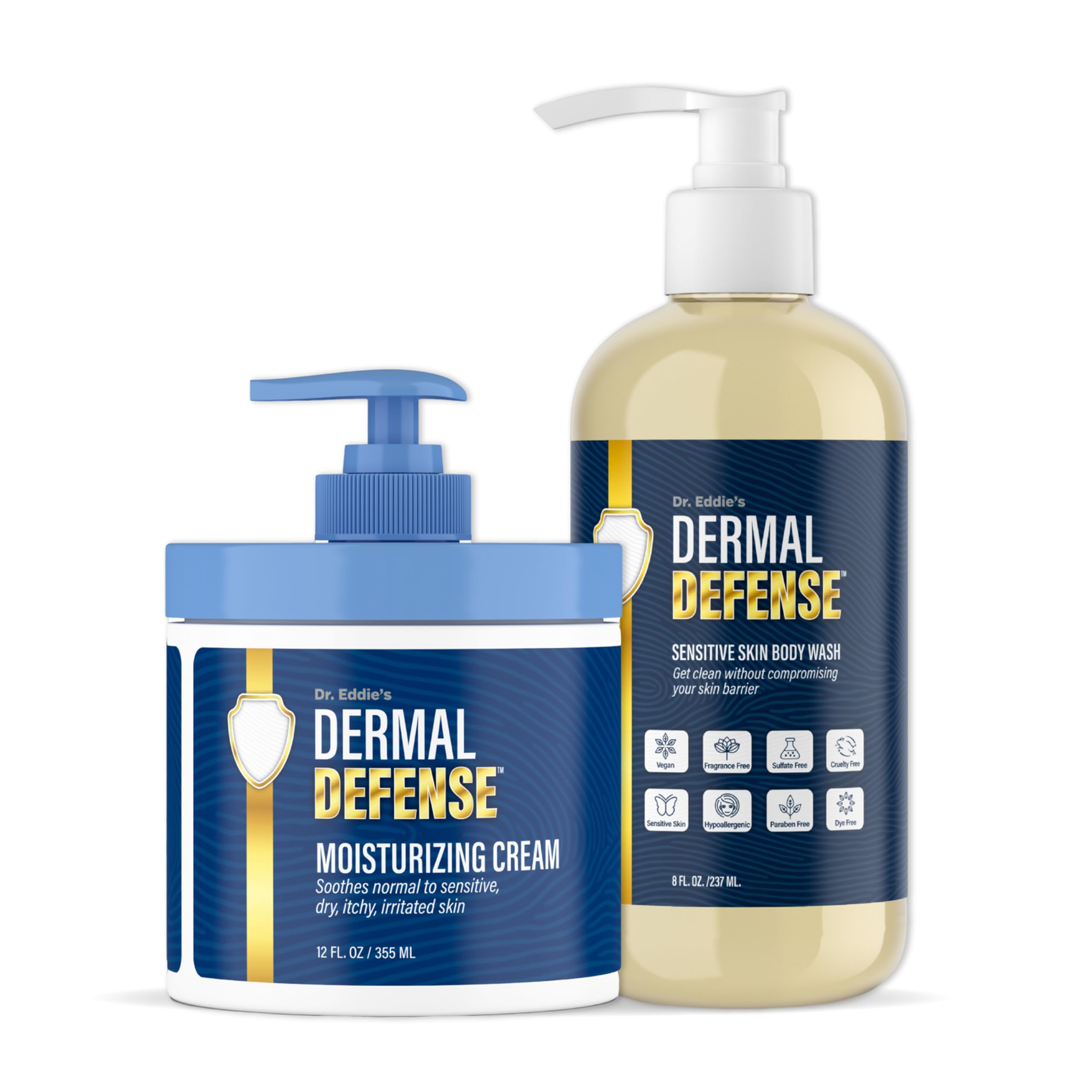 Dr. Eddie's Dermal Defense Bundle - Sensitive Skin Body Wash & Moisturizing Cream for Dry Itchy Eczema Prone Skin Unscented Hydration for Men & Women - 8 oz Body Wash & 12 oz Moisturizer