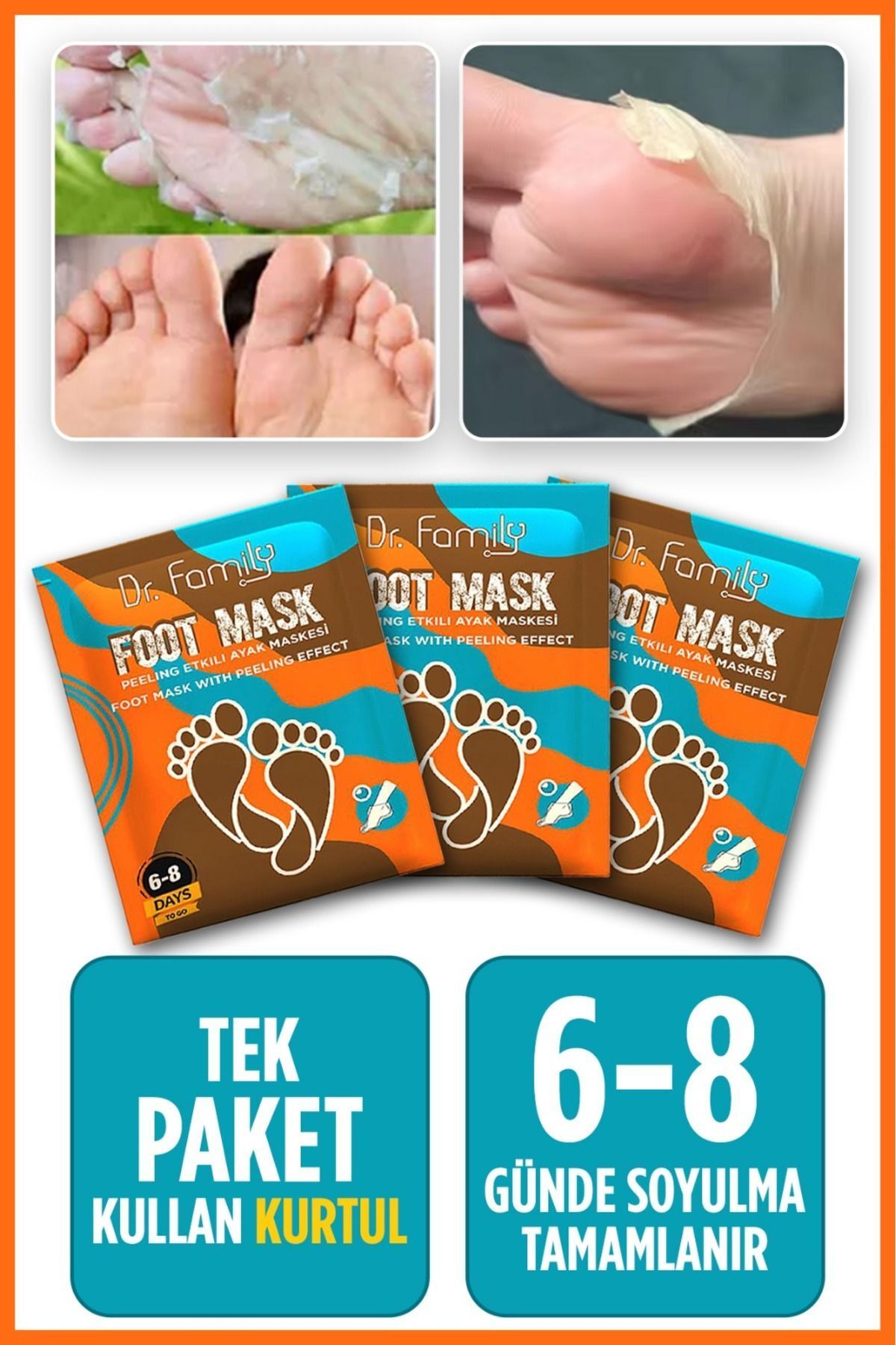 DR Family Foot Peeling Mask Usage: First, wash and dry your feet. Put on the booties on your feet. Close the ankles with the adhesive tapes provided in the packages. Wait 90 minutes (1.5 hours). Remove the booties and wash your feet.