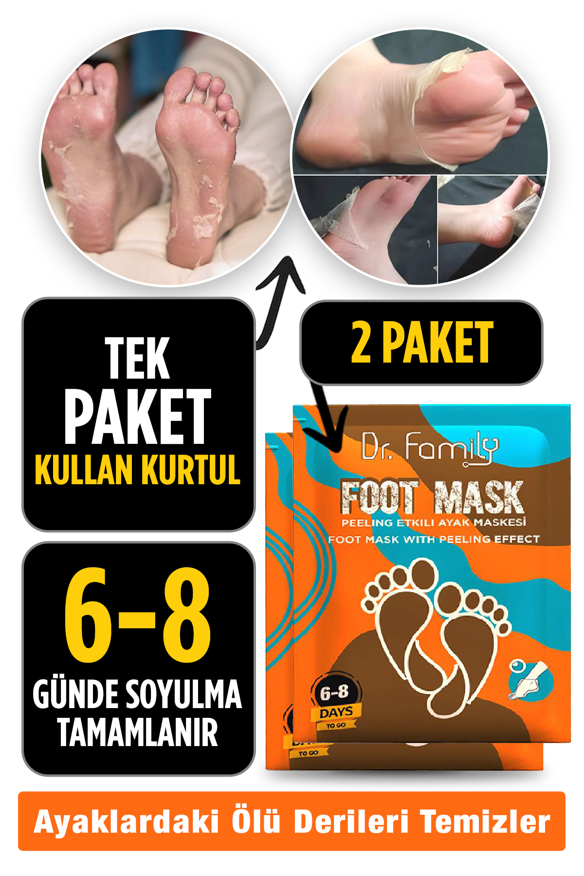 Dr Family Ayak Maskesi, ayaklarinizdaki ölü deriyi etkili bir sekilde soyar veayak kokusunu gidermeyeyardimci olur. 2. günden itibaren peeling etkisini gösterir vetamamlayici bir bakim sunarak6-8 gün içinde yumusacik ayaklara sahip olmanizi saglar.Ayak bakimiiçin pratik bir çözüm sunan bu ürün,tek kullanimdaölü deriyi arindirir ve ferah bir his saglar.