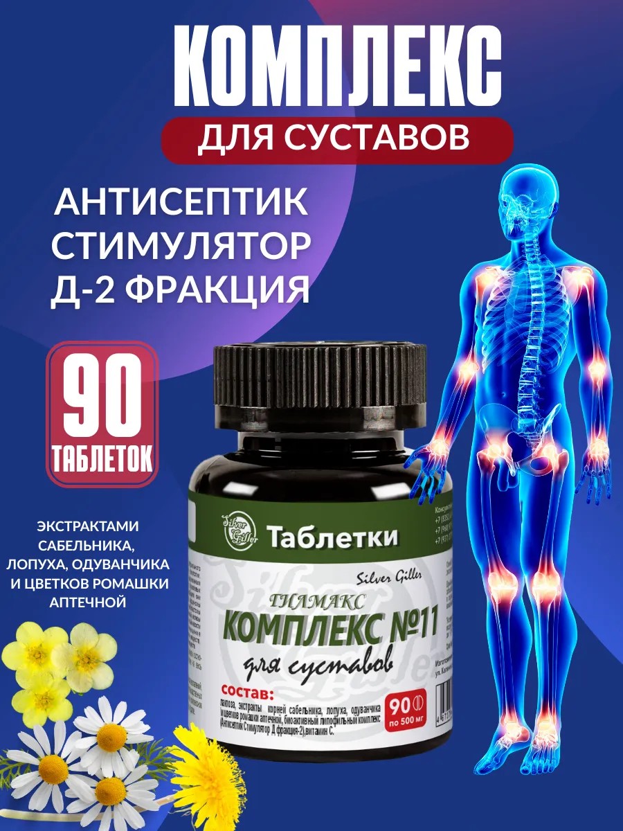 Натуральный препарат в форме таблеток Гилмакс Комплекс «Для суставов» - содержит Антисептик Стимулятор Дорогова фракции-2 и экстракты сабельника, лопуха, одуванчика и цветков ромашки аптечной, предназначен для применения при опухолевых изменениях различной стадии: крови, поджелудочной железы, аутоиммунных нарушениях, после операционных вмешательств, для быстрого восстановления, при снижении тонуса организма, для очищения крови от продуктов распада после химио и лучевой терапии, для разжижения крови, для восстановления костно-мышечной системы организма. . В банке - 90 таблеток. Состав: экстракты сабельника, лопуха, одуванчика и цветков ромашки аптечной, Антисептик Стимулятор Д-2 фракции, лактоза, витамин С. Бад не содержит ГМО, глютен и пшеницу. Бад не является лекарством. Оригинал. Российское производство.