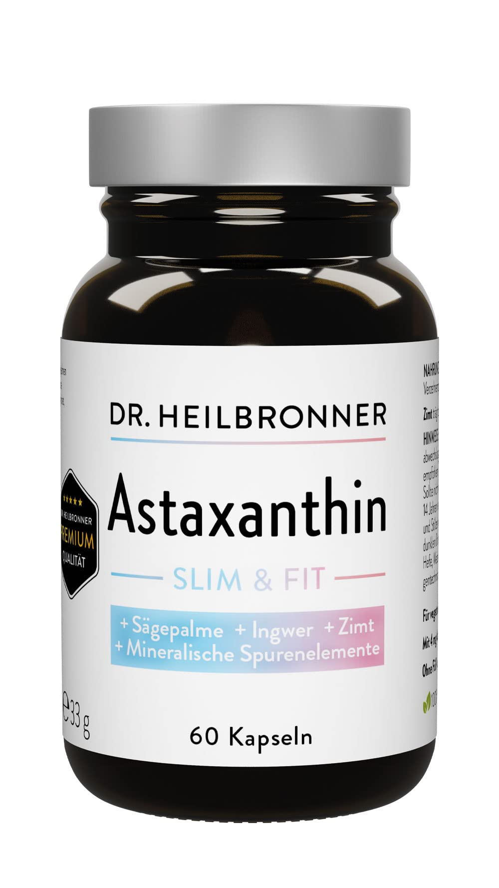 Dr.Heilbronn Astaxanthin + saw palm extract-ginger extract and cinnamon extract vegan!If you want to lose weight, you usually start changing your diet and searches for help through weight loss tablets or diet pills.If you look for natural support, you will always find indications of the cinnamon spice - a so -called metabolic booster of calories should help.Ginger could accelerate the metabolism.A fat burner complex with these active ingredients, one says, could not only be a remedy for losing weight, but also regulate the acid-base balance-lower the triglycerides and promote muscle building.The previously rather unknown astaxanthin, which is obtained from the blood rain algae - Haematococcus pluvialis - is said that it is an extremely strong antioxidant.It is believed that free radicals can even combat free radicals than vitamin C-as well as, natural UV protection and anti-aging effect.We lead astaxanthin as powder and as capsules, pure and in various innovative combinations of active ingredients.How is Astaxanthin by Dr.Produced Heilbronn?Production takes place under laboratory conditions in photobioreactors using spring water from our own deep well.The high quality of the active ingredient is guaranteed by the CO2 extraction process.In general, it is assumed that carotenoids could increase the ability to concentrate and support strengths in the immune system.It is believed that the antioxidants could be anti -inflammatory and could participate in cell protection.The microalgae produce Astaxanthin as cell protection to protect their genetic material and organelles from UV light in the event of dry periods.We do without fillers and additives - our products are of course free of genetic engineering. Ingredients / ingredients Ginger extract, cinnamon extract, saw palm extract, natural astaxanthin (from Astaxanthin biomass extract from the alge haematococcus pluvialis), zinc bisglycinate, copper gluconate, chrome (III) picolinate, capsule cover: hydroxypropyl cell cellulose.our philosophy - a symbiosis of nature and innovation.High -quality premium supplements made from sustainably grown raw materials exclusively from carefully selected regional producers.60 Astaxanthin capsules - natural astaxanthin made of astaxanthin biomass extract from the algae haematococcus pluvialis - Made in Germany - capsule cover made of hydroxypropylmethyl cellulose.Smart capsules - fat blockers or metabolic boosters are commonly called an active ingredient combination that you could be that it could be helpful to lose weight and that fat deposits should counteract.Premium quality dietary supplements, according to the cholesterol and blood sugar levels, should lower the estrogen level and hormone balance and stimulate metabolism.Astaxanthin capsules with saw palm - ginger and cinnamon - These 4 vegetable components are intended to boost a strong supportive effect in metabolism and calorie burn. Dr. Heilbronner Astaxanthin + Sägepalme-Extrakt - Ingwer-Extrakt und Zimt-Extrakt vegan ! Wer Gewicht verlieren möchte beginnt meist mit einer Ernährungs-Umstellung und sucht Hilfe durch Abnehmtabletten oder Diätpillen . Sucht man nach natürlicher Unterstützung findet man immer wieder Hinweise auf das Gewürz Zimt - einem sogenannten Stoffwechsel-Booster der Kalorien verbrennen helfen soll. Ingwer könnte beim Stoffwechsel beschleunigen hilfreich sein. Ein Fatburner Komplex mit diesen Wirkstoffen, so sagt man, könnte nicht nur ein Mittel zum Abnehmen sein, sondern auch das Säure-Basen-Gleichgewicht regulieren - die Triglyceride senken und den Muskelaufbau fördern. Dem bisher eher unbekannten Astaxanthin, welches hier aus der Blutregenalge - Haematococcus Pluvialis - gewonnen wird, sagt man nach, dass es ein extrem starkes Antioxidans ist. Es wird vermutet, dass es freie Radikale sogar stärker bekämpft als Vitamin C - sowie, einen natürlichen UV-Schutz und Anti-Aging Effekt erzeugen könnte. Wir führen Astaxanthin als Pulver und als Kapseln, pur und in verschiedenen innovativen Wirkstoffkombinationen. Wie wird Astaxanthin von Dr. Heilbronner produziert? Die Produktion erfolgt unter Laborbedingungen in Photobioreaktoren unter Verwendung von Quellwasser aus eigenen Tiefbrunnen. Durch das CO2-Extraktionsverfahren wird die hohe Qualität des Wirkstoffes gewährleistet. Allgemein nimmt man an, dass Carotinoide eine Steigerung der Konzentrationsfähigkeit bewirken und beim Immunsystem stärken unterstützen könnten. Man vermutet, dass das Antioxidants entzündungshemmend sein und beim Zellschutz mitwirken könnte. Die Mikroalgen produzieren Astaxanthin als Zellschutz, um ihr Erbgut und ihre Organellen im Fall von Trockenperioden vor UV-Licht zu schützen. Wir verzichten gänzlich auf Füllstoffe und Zusatzstoffe - unsere Produkte sind selbstverständlich frei von Gentechnik . INHALTSSTOFFE / ZUTATEN Ingwer Extrakt, Zimt Extrakt, Sägepalmen Extrakt, natürliches Astaxanthin (aus Astaxanthin Biomasse Extrakt aus der Alge Haematococcus pluvialis), Zinkbisglycinat, Kupfer Gluconat, Chrom-(III)-Picolinat, Kapselhülle: Hydroxypropylmethylzellulose.UNSERE PHILOSOPHIE - eine Symbiose aus Natur und Innovation. Hochwertige Premium Supplements aus nachhaltig angebauten Rohstoffen ausschließlich von sorgfältig ausgewählten, regionalen Produzenten. 60 ASTAXANTHIN-KAPSELN - natürliches Astaxanthin aus Astaxanthin Biomasse Extrakt aus der Alge Haematococcus Pluvialis - hergestellt in Deutschland - Kapselhülle aus Hydroxypropylmethylcellulose. ABNEHMKAPSELN - Fettblocker oder Stoffwechselbooster nennt man landläufig eine Wirkstoff-Kombi der man nachgesagt, dass sie Hilfe zum Abnehmen sein könnte und Fettablagerungen entgegen wirken soll. PREMIUM-QUALITÄT Nahrungsergänzungsmittel das, so heißt es, Cholesterin und Blutzuckerspiegel senken - den Östrogenspiegel und Hormonhaushalt regulieren und den Metabolismus anregen können soll. ASTAXANTHIN-Kapseln mit Sägepalme - Ingwer und Zimt - diese 4 pflanzlichen Komponenten 