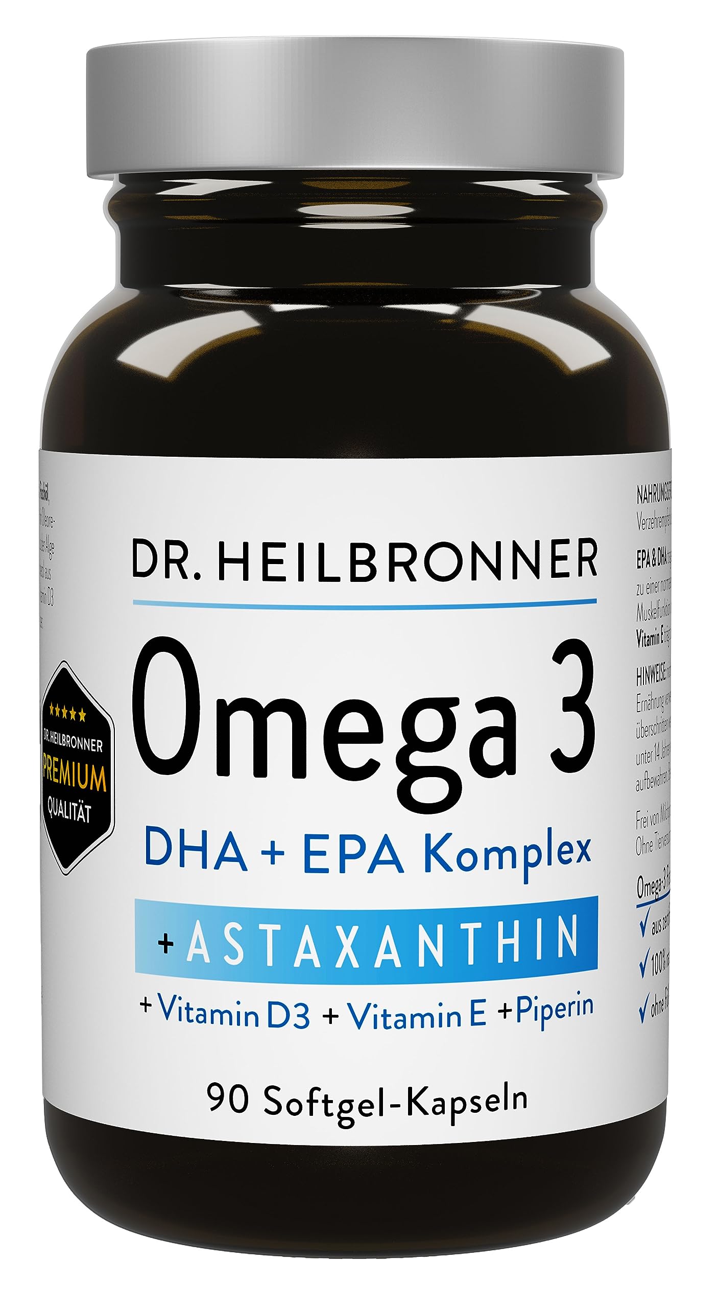 Dr. Heilbronner Omega 3 Astaxanthin Kapseln mit Vitamin D3 Vitamin E und Piperin in der Glasflasche I Astaxanthin aus Algastin Oleoresin aus der Alge Haematococcus Pluvialis I 90 Gelatine-Kapseln