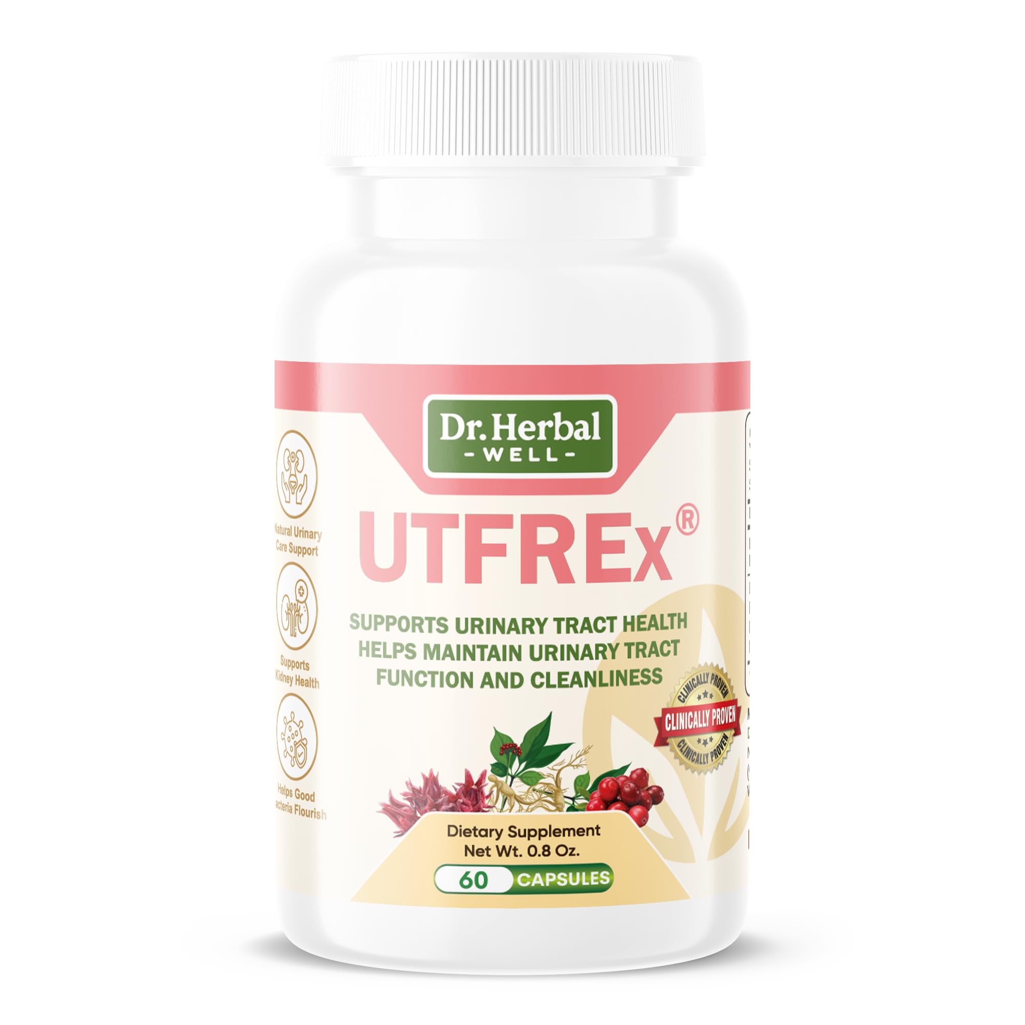 DR. HERBAL WELL UTFREX Clinically Proven Urinary Tract UTI Health Supplement Natural Support Cleanse Flush Protect (No Probiotics & D-Mannose) 60 Capsules