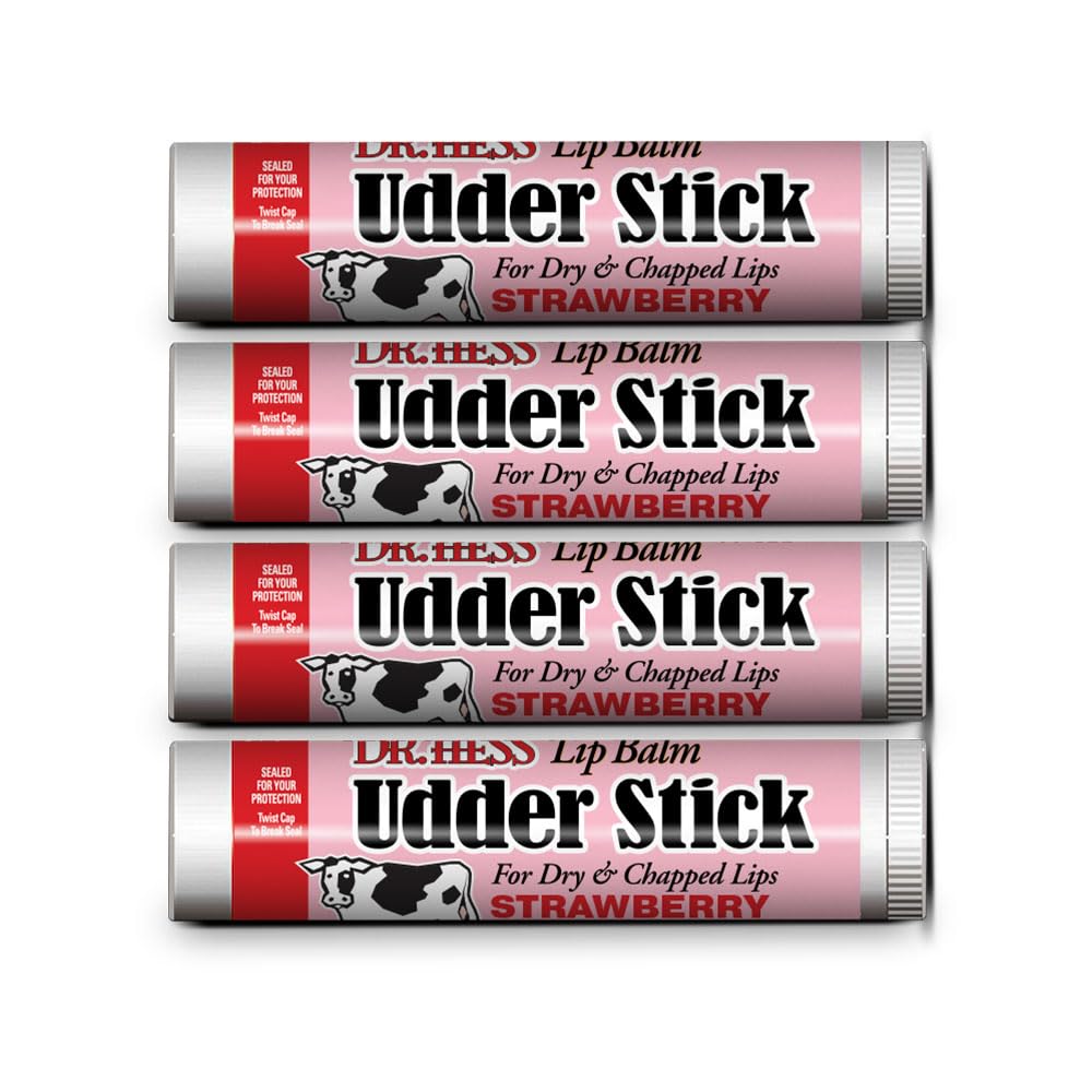 Dr. Hess Original Udder Stick Lip Balm Soothing Moisturizer Sun Screen Balm for Dry Lips with Jojoba Beeswax & Shea Butter Total Lip Care Hydration & Repair Strawberry Flavor 4 Pack