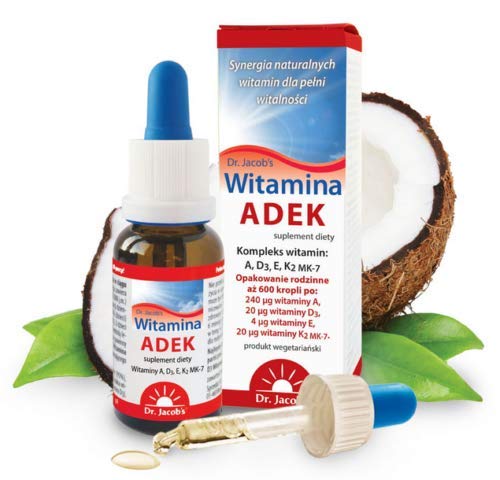 Vitamin ADEK Dr. Jacob's is: A complex of all four fat-soluble vitamins Broad spectrum of action The highest quality natural vitamins Vitamins already dissolved in natural MCT coconut oil With a slight citrus aftertaste thanks to bergamot oil Optimal bioavailability: absorbed in the mouth! Vitamin Drops ADEK Dr. Jacob's is the first such product on the market. Due to the fact that the vitamins are dissolved in oil, they are absorbed directly into the bloodstream in the mouth (bypassing the digestive system). Vitamins A, D3, E and K2 have a scientifically proven beneficial effect on the proper functioning of the body: Vitamin A for: proper vision, functioning of the immune system, maintaining healthy skin, proper condition of mucous membranes, iron metabolism. Vitamin D3 for: immune system, calcium absorption, healthy bones and teeth, muscle function. Vitamin E for: protecting cells against oxidative stress and slowing down the aging process (vitamin E is one of the strongest natural antioxidants). Vitamin K2 for: proper blood clotting, healthy bones and teeth. Sources of vitamins: Vitamin A is obtained in one of the best European laboratories in the synthesis process (synthesis, i.e. the combining process). Vitamin D3 is obtained from lanolin from sheep's wool (extracted using UV radiation). Vitamin E (a mixture of natural tocopherols) is obtained from vegetables. Vitamin K2 Dr. Jacob's is special because it contains the highest amount of pure menaquinone-7 (MK-7), which has very high bioavailability and bioactivity. It does not contain any allergens or GMO contaminants. MCT oil In Dr. products Jacob's liquid vitamins A, D, E and K use the MCT fatty acid fraction obtained from coconut oil. Unlike coconut oil itself, which is rich in saturated fatty acids, which, as a food product, are not beneficial to health, medium-chain fatty acids (MCTs) have many beneficial health and dietary properties, many of which are scientifically confirmed. One of them is that MCT does not negatively affect the blood lipid profile and does not increase the risk of cardiovascular diseases. The use of MCT has a very beneficial effect on the durability of the vitamins dissolved in this oil. Compared to other oils, MCT also has a much greater resistance to rancidity. Thanks to this, vitamins Dr. Jacob's may have a maximum shelf life. MCT oil has no taste, which is important when giving vitamins to young children. Vitamin ADEK Dr. Jacob's is dissolved in MCT coconut oil. It ensures the stable duration of vitamins for min. 2 years and ensures the freshness and effectiveness of the product. The addition of bergamot oil gives a pleasant aftertaste. Recommended daily dose and method of use: drop on a spoon or directly into the mouth. Drop into the mouth and spread with the tongue. Additional information: children and adults, in particular: obese (BMI 30 kg m2), pregnant and breastfeeding women, working at night, with dark skin: a drop children up to 18 months of age and premature babies - after consulting a doctor: a drop. Pregnancy and breastfeeding - taking products with vitamin D during pregnancy and breastfeeding should be consulted with a doctor. Note: The product should not be consumed by people taking anticoagulants containing vitamin K antagonists (e.g. warfarin and acenocoumarol). Such people should consult the use of the product with their doctor! The content of bioactive vitamin E may cause a slight "scratchy" feeling in the throat in some people with irritated mucous membranes.Vitamins A, D, E, K in MCT oil.DR JABOB'S WITAMINA ADEK SUPLEMENT DIETY W KROPLACH 20ML Witamina ADEK Dr. Jacob's to: Kompleks wszystkich czterech witamin rozpuszczalnych w tluszczach Szerokie spektrum dzialania Najwyzszej jakosci naturalne witaminy Witaminy juz rozpuszczone w naturalnym oleju MCT z kokosa Z lekkim posmakiem cytrusowym dzieki olejkowi z bergamotki Optymalna biodostepnosc: wchlaniaja sie juz w ustach! Krople Witamina ADEK Dr. Jacob's to pierwszy taki produkt na rynku. Dzieki temu, ze witaminy sa rozpuszczone w oleju, juz w ustach wchlaniaja sie bezposrednio do krwiobiegu (z pominieciem ukladu pokarmowego). Witaminy A, D3, E i K2 maja naukowo dowiedziony korzystny wplyw na prawidlowe funkcjonowanie organizmu: Witamina A dla: prawidlowego widzenia, funkcjonowania ukladu odpornosciowego, zachowania zdrowej skóry, prawidlowego stanu blon sluzowych, metabolizmu zelaza. Witamina D3 dla: ukladu odpornosciowego, przyswajania wapnia, zdrowych kosci i zebów, funkcji miesni. Witamina E dla: ochrony komórek przed stresem oksydacyjnym i spowalniania procesów starzenia (witamina E to jeden z najsilniejszych naturalnych antyutleniaczy). Witamina K2 dla: prawidlowej krzepliwosci krwi, zdrowych kosci i zebów. Zródla witamin: Witamina A pozyskiwana jest w jednym z najlepszych laboratoriów europejskich w procesie syntezy (synteza, czyli proces laczenia). Witamina D3 pozyskiwana jest z lanoliny z welny owczej (ekstrahowana za pomoca naswietlania promieniami UV). Witamina E (mieszanka naturalnych tokoferoli) pozyskiwana jest z warzyw. Witamina K2 Dr. Jacob's jest szczególna, gdyz zawiera najwyzsza ilosc czystego menachinonu-7 (MK-7), który ma bardzo wysoka przyswajalnosc oraz bioaktywnosc. Nie ma w niej alergenów oraz zanieczyszczen GMO. Olej MCT W produktach Dr. Jacob's z witaminami A, D, E i K w plynie stosujemy frakcje kwasów tluszczowych MCT, pozyskiwana z oleju kokosowego. W przeciwienstwie do samego oleju kokosowego, bogatego w nasycone kwasy tluszczowe, które, jako produkt spozywczy, nie sa korzystne dla zdrowia, sredniolancuchowe kwasy tluszczowe MCT maja wiele korzystnych wlasciwosci zdrowotnych oraz dietetycznych, z których wiele jest potwierdzona naukowo. Jedna z nich jest to, ze MCT nie wplywa negatywnie na profil lipidowy krwi i nie zwieksza ryzyka wystapienia chorób ukladu krazenia. Zastosowanie MCT ma bardzo korzystny wplyw na trwalosc witamin rozpuszczonych w tym oleju. W porównaniu z innymi olejami, MCT ma 