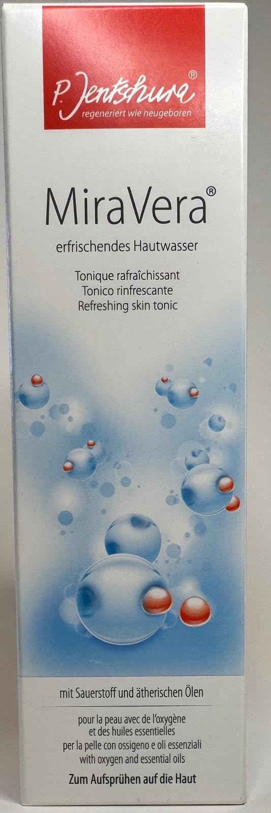 Enriched with high-purity oxygen and 21 essential oils, MiraVera brings an extraordinary sense of well-being on the skin. High-quality ylang-ylang oil nourishes and softens the skin. In addition to thyme oil, which not only promotes circulation but also has wonderfully cleansing properties, the lemony bergamot oil has an invigorating and revitalizing effect. Ingredients: Aqua (Aqua demin.), Alcohol (Ethyl alcohol), Hydrogen Peroxide ( 2 ), Pinus Mugo Leaf Oil, Salvia Officinalis Oil, Pelargonium Graveolens Leaf Oil, Aniba Rosaeodora Wood Extract, Illicium Verum Fruit Oil, Cymbopogon Winterianus Herb Oil, Pinus Sylvestris Leaf Oil, Melaleuca Alternifolia Leaf Oil, Citrus Bergamia Peel Oil Expressed, Eugenia Caryophyllus Leaf Oil, Citrus Aurantium Dulcis Peel Oil Expressed, Juniperus Virginiana Wood Oil, Cananga Odorata Flower Oil, Rosmarinus Officinalis Leaf Oil, Thymus Vulgaris Oil, Carum Carvi Fruit Oil, Cupressus Sempervirens Leaf Oil, Citrus Limon Peel Oil, Santalum Album Wood Oil, Lavandula Angustifolia Herb Oil, Juniperus Communis Fruit Oil, Polyglyceryl-10 Laurate, Linalool, Limonenesuitable for all skin types, good skin compatibility. MiraVera actively supports the skin in its regeneration and harmonizes the skin metabolism. It nourishes and soothes reddened and stressed skin. The innovative oxygen product refines the appearance of the skin and optimizes its elasticity - a beautiful and nourishing skin toner on face, neck, décolleté and chest. MiraVera by Dr. Peter Jentschura is a Skin Tonic loaded with oxygen.It contains a carefully selected, powerful combination of 21 essential oils. MiraVera has a very fresh and rejuvenating scent. Free of silicones, mineral oils, parabens and PEGs , dermatologically confirmed.