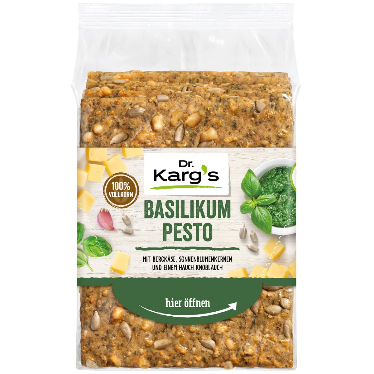 Mission Crafts: We think that you deserve: 100 delicious, 0 frills.As a family -run bakery, solid crafts, tradition and naturalness comes first - let's make the world a snackier place.Sustainability: Our products are baked in energy -optimized ovens without energy -consuming cooling tunnels.We use photovoltaic systems on the bakery's flat roofs for energy generation.We produce 100 in Germany, keep shipping routes briefly and secure valuable jobs in the region.As a partner of ""Too Good to Go"", we also campaign against food waste.Fresh stove reclassable: For us, crispy enjoyment is incredibly important for every bite.Therefore, our crispbread is packed freshly after cooling.Our packaging is equipped with a reclassable front side label, which ensures that the crispbread can remain fresh and crispy.Quality: Our crispbread made of whole grain flour is made from carefully selected natural ingredients.We use high -quality flour from mills from Germany.The crispbread is also rich in fiber, which can play an important role in your digestion.Tasting experience: Our crispbread à la Italia ensures a fragrant basil, spicy mountain cheese and a hint of garlic for a summer enjoyment break.Perfect as a fast, balanced meal or for hunger in between.MISSION HANDWERK: Wir finden, das hast du dir verdient: 100 lecker, 0 SchnickSchnack. Als familiengeführte Bäckerei steht für uns solides Handwerk, Tradition und Natürlichkeit an erster Stelle – let's make the world a snackier place. NACHHALTIGKEIT: Unsere Produkte werden in energieoptimierten Backöfen ohne energiefressende Kühltunnel gebacken. Photovoltaikanlagen auf den Flachdächern der Bäckerei nutzen wir zur Energiegewinnung. Wir produzieren zu 100 in Deutschland, halten Versandwege kurz und sichern wertvolle Arbeitsplätze in der Region. Als Partner von "Too Good To Go" setzen wir uns zudem gegen Lebensmittelverschwendung ein. OFENFRISCH WIEDERVERSCHLIEßBAR: Für uns ist ein knuspriger Genuss bei jedem Bissen unglaublich wichtig. Deshalb wird unser Knäckebrot direkt nach dem Abkühlen ofenfrisch verpackt. Unsere Verpackung ist mit einem wiederverschließbaren Vorderseitenetikett ausgestattet, welches dafür sorgt, dass das Knäckebrot länger frisch knusprig bleiben kann. QUALITÄT: Unser Knäckebrot aus Vollkornmehl wird aus sorgfältig ausgewählten, natürlichen Zutaten hergestellt. Wir verwenden hochwertiges Mehl von Mühlen aus Deutschland. Das Knäckebrot ist zudem reich an Ballaststoffen, welche eine wichtige Rolle für deine Verdauung spielen können. GESCHMACKSERLEBNIS: Unser Knäckebrot à la Italia sorgt mit duftendem Basilikum, würzigem Bergkäse und einem Hauch Knoblauch für eine sommerliche Genuss-Auszeit. Perfekt als schnelle, ausgewogene Mahlzeit oder für den Hunger zwischendurch.Dr. Karg's Knäckebrot Basilikum Pesto - knusprig, vegetarisch, mit Bergkäse Basilikum, reich an Ballaststoffen, 100 Vollkorn ohne Zusatzstoffe, 10x200g