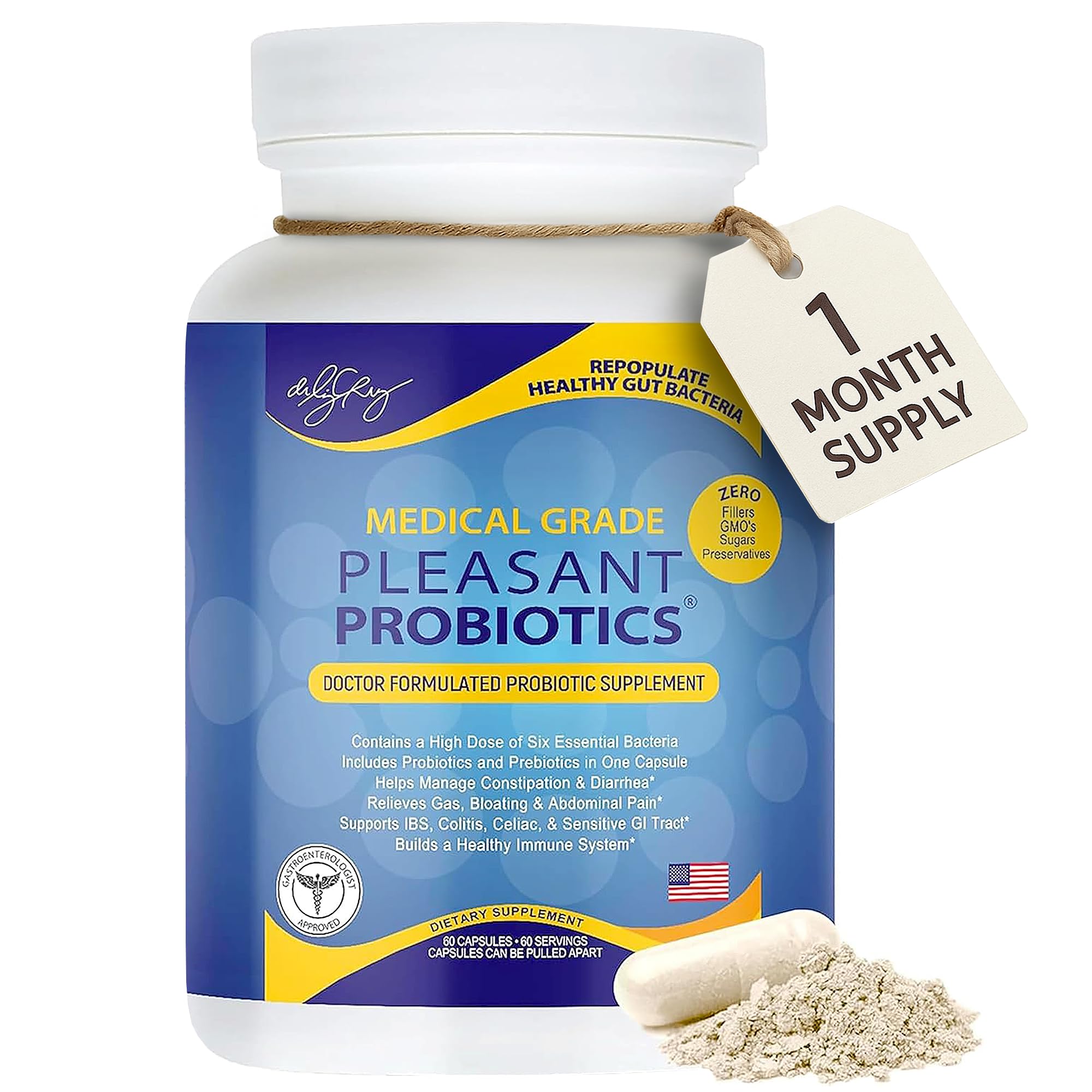 Clean, Potent Formula - We pioneer a healthy revolution with our probiotics for gas, bloating and constipation capsules formulated by Gastroenterologist Dr. Liz Cruz — a premium quality, medical-grade gastro gallbladder supplements with high potency and zero fillers. Daily Simple Dose of Nourishment - Take one capsule of this probiotic blend when you rise in the morning and one before going to bed. If swallowing pills is challenging, this wellness formula can be taken apart and mixed into food or your favorite drinks for effortless consumption. It's an easy-to-take formula for kids. Well-Rounded Formula- Probiotics are crucial for your immune system, which is 70-80 in your gut. Pleasant Probiotics provides the same benefits as 20 yogurts, without the sugar. Perfect for digestion, absorption, and overall gut health. Ideal for pets, kids, and lactating mothers. A Plethora of Benefits - Our adult and children's probiotic blend does not only benefit the gut. It's a candida support, gallbladder support, and bloat relief supplement that also strengthens your body's natural defenses. Bolster Your Gut Health - Maintain digestive balance with Pleasant Probiotics. Stress, poor diet, and antibiotics can disrupt your gut health. Each serving delivers 5.10 billion CFUs, replenishing good agents for optimal gastrointestinal health. Take daily to combat gas, bloating, and other digestive issues.