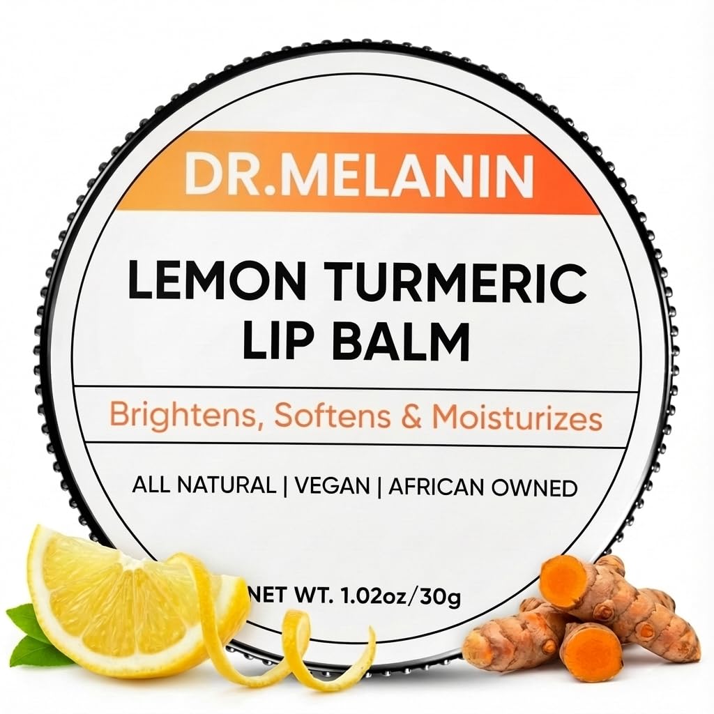 Dr. Melanin Lemon Turmeric Lip Balm is a natural lip moisturizer that helps nourish, soften, and smooth lips while supporting a more even and healthy-looking tone. Infused with turmeric, honey, lemon oil, jojoba, and shea butter, it provides long-lasting hydration for dry or dull lips, including those affected by smoking. The lightweight, non-greasy formula absorbs quickly, leaving lips soft, supple, and refreshed. Perfect for daily use, it doubles as a lip base to prep lips before applying lipstick or gloss. All-natural, cruelty-free, and African-owned, this balm helps maintain beautiful, moisturized lips for all skin tones.Clean and conscious beauty: All-natural, cruelty-free, and African-owned, proudly made to promote self-care and confidence for all skin tones. Portable and travel-friendly: Packaged in a compact 1.02 oz tin, making it easy to carry in your purse, pocket, or travel bag for on-the-go hydration anytime. Non-greasy and fast-absorbing: Lightweight, smooth texture absorbs quickly without feeling sticky or heavy, perfect for day or night use and comfortable wear under lipstick or gloss. Supports even lip tone: Helps improve the appearance of dark or uneven lips, including those affected by dryness or smoking, revealing a more balanced, radiant look over time. Natural lip moisturizer: Hydrates and nourishes dry or dull lips with all-natural turmeric and lemon. Formulated with jojoba oil, shea butter, beeswax, and honey for soft, smooth, and healthy-looking lips.