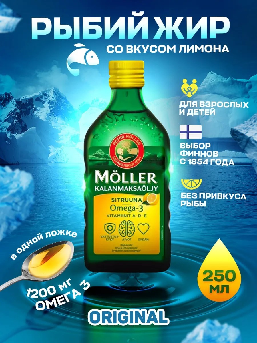 Рыбий жир Möller - масло со вкусом лимона, произведен в Норвегии из печени трески, обитающей в северной части Атлантического океана, и выпускается в бутылке из стекла.