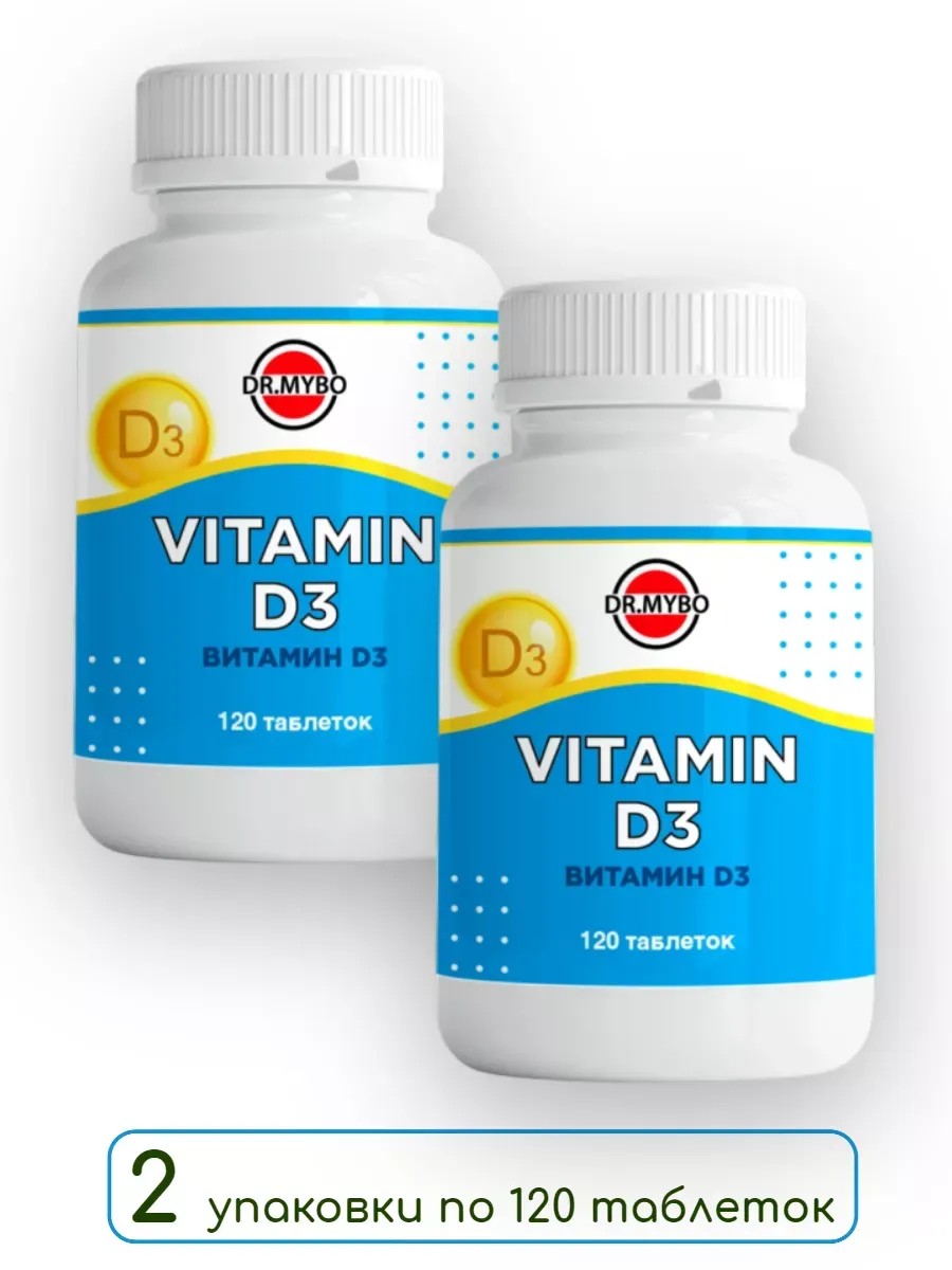 Dr mybo витамин D3 - биологически активная добавка (БАД) к пище. Витамин Д необходим все жителям европейской части России. Из-за частого отсутствия солнечных лучей витамин не успевает синтезироваться, из-за чего происходит снижение иммунитета и торможение усваивания кальция. Витамин D3 необходим для поддержания здоровья костей, зубов. Витамин D3 снижает риск развития остеопороза, сердечно-сосудистых и аутоиммунных заболеваний, улучшает настроение, поскольку стимулирует выработку серотонина, «гормона радости».Упаковка содержит 120 таблеток. Принимать взрослым по 2 таблетки в день во время еды. Продолжительность приема: 1 месяц. При необходимости прием можно повторить. Возможны повторные приемы в течение года. Перед применением рекомендуется проконсультироваться с врачом.1 таблетка содержит (в среднем): 7,5мкг (300МЕ) витамина D3.