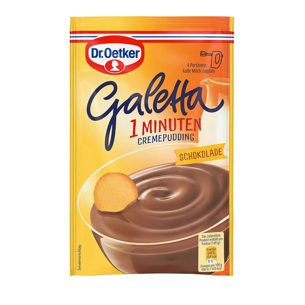 Dr. Oetker Galetta Chocolate: The quick way to enjoy a cream pudding with galetta – 1 minute of chocolate cream by Dr. Oetker. Easy preparation - Many recipes. INGREDIENTS Ingredients: Sugar, modified starch, 12 low-fat cocoa powder, glucose syrup, gelling agent (carragee), stabilizer (calcium lactate), palm fat, emulsifiers (E 472a, E 471), salt, flavoring, milk. INSTRUCTIONS Chocolate pudding cream for 500 ml of milk (serves 4): 1. Pour cold milk into a mixing bowl. 2. Add the cream powder and mix briefly with a mixer (or whisk) at the lowest speed. Then, for 1 minute, mix until creamy at the highest speed. 3. Fill jars or a bowl with the pudding cream. Refrigerate until ready to serve. See moreDr. Oetker Galetta Crempudding Chocolat 99 gDESCRIPTION DU PRODUIT DESCRIPTION DU PRODUIT Dr. Oetker Galetta Chocolat Le moyen rapide de déguster un pudding à la crème avec galetta – 1 minute de crème au chocolat par Dr. Oetker. Préparation facile - Nombreuses recettes. INGRÉDIENTS Ingrédients : sucre, amidon modifié, poudre de cacao 12 peu grasse, sirop de glucose, agent gélifiant (carragee), stabilisateur (lactate de calcium), graisse de palme, émulsifiants (E 472a, E 471), sel, arôme, lait de lait. MODE D'EMPLOI Crème pudding chocolat pour 500 ml de lait (pour 4 portions) 1. Versez du lait froid dans un bol mélangeur. 2. Ajoutez de la poudre de crème et mélangez brièvement avec un mixeur (agitateur) à la vitesse la plus faible. Ensuite, 1 min. Mélangez de manière crémeuse au maximum. 3. Remplir le pudding crème dans des bocaux ou un bol. Placer au réfrigérateur jusqu'à servir. Voir plus