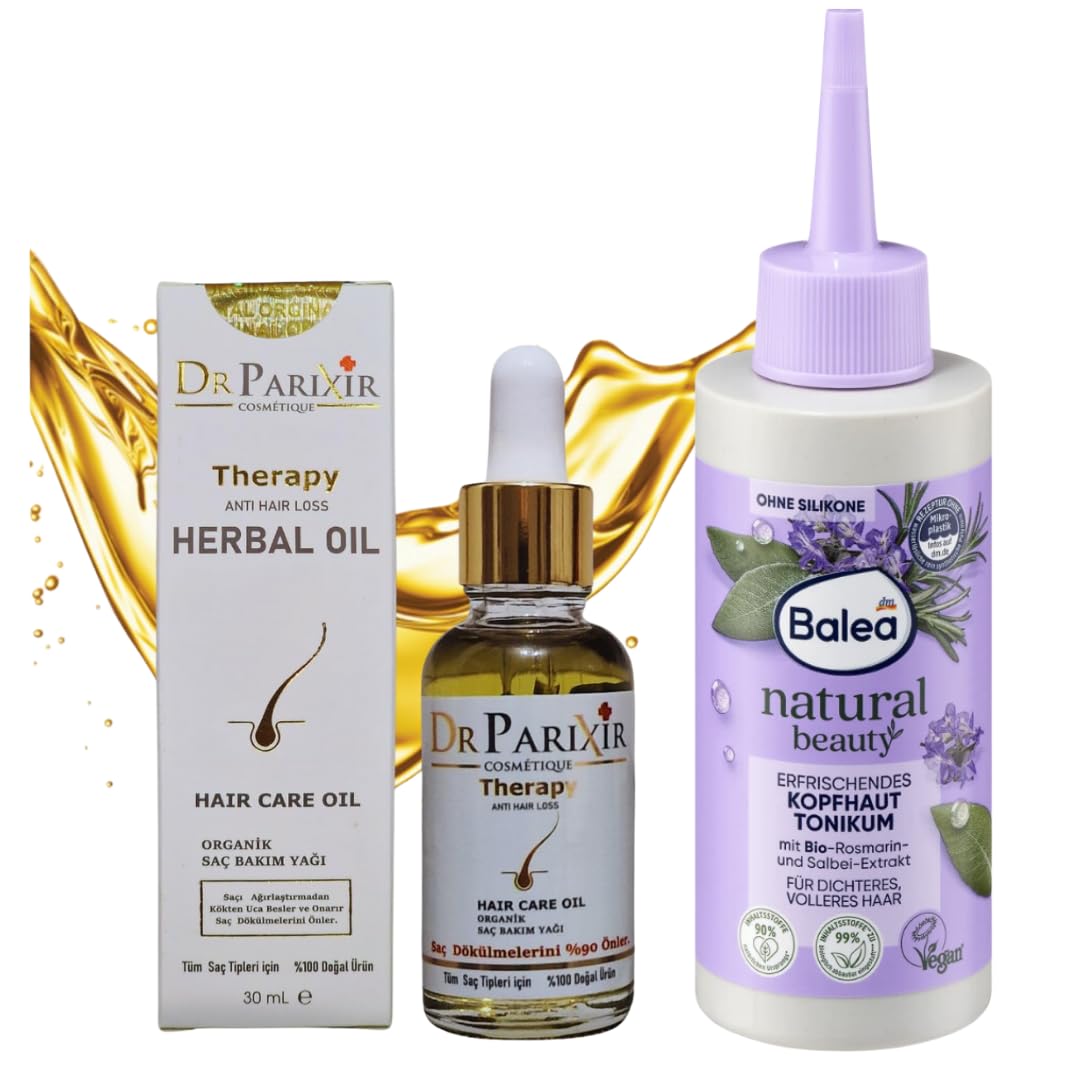 Dr. Parixir Hair Loss Therapy is an effective hair loss solution that harnesses the power of natural ingredients. This unique formula is enriched with natural extracts such as garlic, ginger, bay leaves, rosemary, and lemon to nourish hair from root to tip and promote strong, healthy growth. From the first application, the serum helps prevent hair loss, regulate the scalp's oil and moisture balance, prevent dandruff, and revitalize the scalp. It is also highly effective against scalp irritation, which often occurs when women dye their hair. This carefully developed hair care solution is designed to address a variety of hair and scalp concerns with a single, powerful formula. It promotes hair growth, prevents hair loss, and combats scalp issues such as eczema and patchy hair loss. Thanks to the unique combination of chamomile and olive fruit oils, our hair care oil strengthens hair roots and promotes growth in bald areas. Our hair oil is easy to use and suitable for all hair types, making it an excellent choice for anyone looking to improve the health of their hair and scalp. It is free of silicone, parabens, and other harmful synthetic chemicals, nourishing your hair exclusively with the finest natural ingredients. For best results, Dr. Parixir can be used before bed to allow the ingredients to work overnight. This promotes hair nourishment and repair while you sleep and is ideal for those seeking a natural and effective way to achieve healthy, shiny hair. Experience the transformative effect of our product, which revitalizes your hair, leaving it stronger, healthier, and more resilient to daily wear and tear. Our product contains no perfumes or flavorings because we want to avoid synthetic additives and preserve the true scents of our natural ingredients such as garlic, ginger, bay leaf, rosemary, lemon, and chamomile. Dr. Parixir Anti-Hair Loss Therapy is designed to offer the benefits of naturalness and purity without artificial additives. Directions for use: Apply the serum to clean, dry hair. Massage into the scalp for 5 minutes to ensure complete absorption. Leave the serum on for at least 1-2 hours or overnight. Then, wash it out with shampoo. Sebamed Anti-Hair Loss Shampoo 200 ml With caffeine and ginkgo Promotes growth. pH value: 5.5 Strengthens hair structure. Sebamed Anti-Hair Loss Shampoo contains an NHE formula with caffeine and ginkgo biloba, which can stimulate scalp blood circulation. Regular use can promote hair growth, strengthen hair, activate hair roots, and combat hereditary hair loss. The pH of 5.5 helps maintain the protective mantle and strengthen the hair structure. INGREDIENTS DrParixir Oil: rosemary, garlic, ginger, bay leaf, lemon, chamomile, black cumin oil, and olive oil SAFETY WARNING For external use only See moreSuitable for all hair types – whether dry, oily, or normal, the combination of Sebamed Shampoo and Dr. Parixir Serum is designed for every hair structure and daily use. Dr. Parixir: alcohol-free, 100 vegan, and free of harmful substances: no parabens, sulfates, silicone, or other synthetic additives, ideal for safe, daily use. Effective for eczema and circular hair loss (alopecia areata) – Dr. Parixir Serum not only helps with eczema but also actively combats circular hair loss, promoting a healthy scalp. Sebamed Shampoo pH 5.5 for a healthy scalp, enriched with creatine, zinc PCA, caffeine, and pyrotone olamine. These active ingredients support hair growth, prevent hair loss, and strengthen the hair structure. The pH 5.5 protects the scalp and improves hair health. Effective hair loss treatment: The combined formula of Sebamed Dr. Parixir actively combats hair loss, stimulates hair growth, and ensures healthier hair. Reduces hair loss by up to 90 – Dr. Parixir Anti-Hair Loss Serum contains a powerful blend of rosemary, garlic, ginger, bay, lemon, chamomile, and olive oils. These active ingredients strengthen hair roots, promote hair growth, and improve hair structure for thicker, fuller hair.Dr. Parixir Sebamed Lot de 2 sérum anti-perte de cheveux (30 ml) avec huile d'olive, romarin shampooing Sebamed anti-perte de cheveux (200 ml) - soins médicaux des cheveux, renforce les racinesDESCRIPTION DU PRODUIT DESCRIPTION DU PRODUIT La thérapie anti-perte de cheveux Dr. Parixir est une solution efficace contre la chute des cheveux qui exploite le pouvoir des ingrédients naturels. Cette formule particulière est enrichie en extraits naturels tels que l'ail, le gingembre, les feuilles de laurier, le romarin et le citron pour nourrir les cheveux de la racine aux pointes et favoriser une croissance forte et saine. Dès la première application, le sérum aide à prévenir la chute des cheveux, à réguler l'équilibre de l'huile et de l'humidité du cuir chevelu, à prévenir la formation de pellicules et à revitaliser le cuir chevelu. En outre, il est très efficace contre l'irritation du cuir chevelu, qui survient souvent lors de la teinture des cheveux chez les femmes. Cette solution de soin des cheveux soigneusement développée vise à traiter une variété de problèmes de cheveux et de cuir chevelu avec une seule formule puissante. Favorise la croissance des cheveux, prévient la chute des cheveux et combat les problèmes du cuir chevelu comme l'eczéma et la perte de cheveux circulaire. Grâce à la combinaison unique de camomille et d'huiles de fruits d'olive, notre huile de soin des cheveux renforce les racines des cheveux et aide à la croissance dans les zones chauves. Notre huile pour cheveux est facile à utiliser et adaptée à tous les types de cheveux, ce qui en fait un excellent choix pour toute personne souhaitant améliorer la santé des cheveux et du cuir chevelu. Il est exempt de silicone, de parabènes et d'autres produits chimiques synthétiques nocifs, nourrissant vos cheveux exclusivement avec les meilleurs ingrédients naturels. Pour de meilleurs résultats, le Dr. Parixir peut être utilisé avant de se coucher pour pe