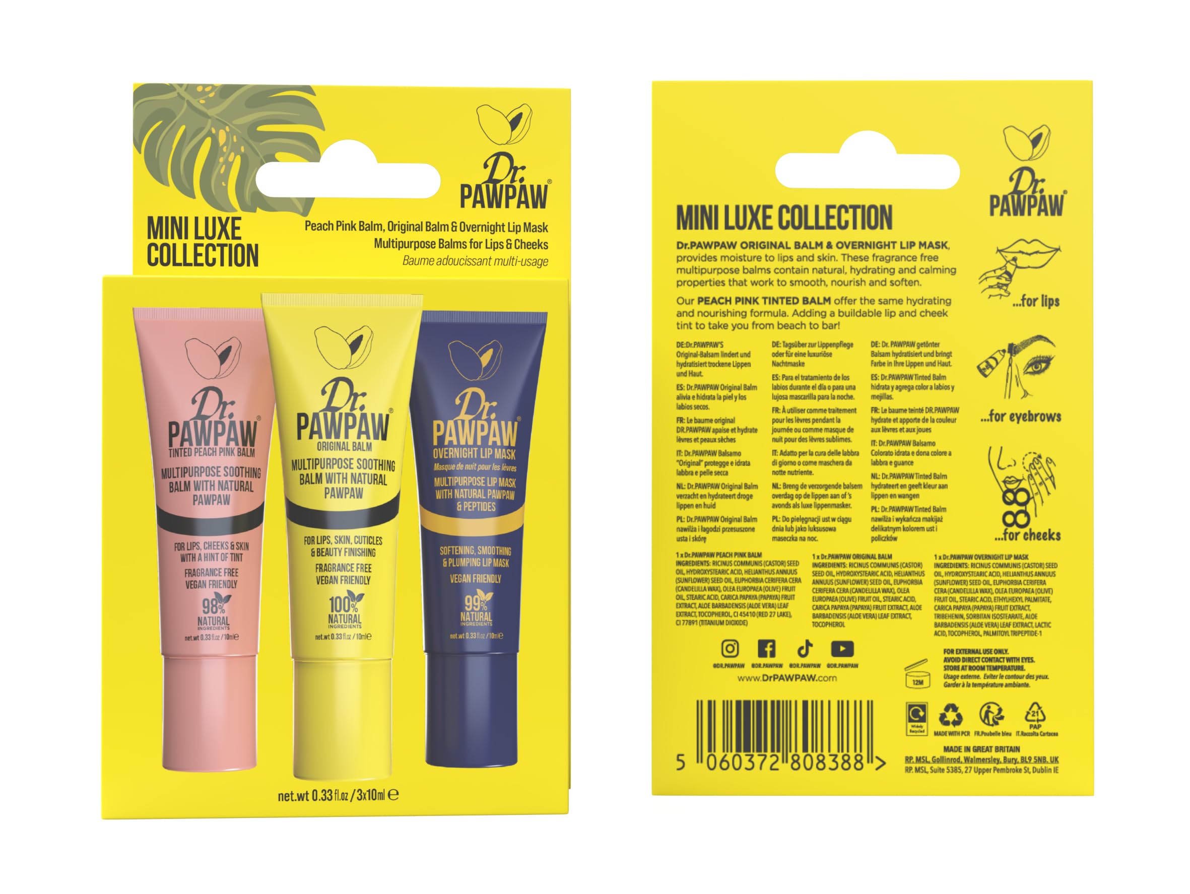 Introducing the Dr. PawPaw Mini Luxe Collection Trio, which includes Lip Balm - Original, Lip Balm - Tinted Peach Pink, and Lip Mask - Overnight. A luxurious giftset that embodies the pinnacle of advanced lip care and beauty. This elegantly curated collection is designed for women who seek the highest quality in antioxidant skincare without compromising on safety or efficacy. Featuring a lip balm and lip mask giftset, this collection offers a seamless blend of nourishment, hydration, and protection. The lip mask works overnight to deliver deep hydration, making it an essential component of your skincare routine. Our lip balm hydrating formula is a testament to the power of nature's finest ingredients, offering a soothing, moisturizing experience like no other. Embrace lip care products with Dr. PawPaw's Mini Luxe Collection Trio, and let your lips experience the transformative power of advanced, antioxidant skincare.NATURAL AND SAFE INGREDIENTS: Our nourishing gluten-free and paraben-free lip balm and lip mask are crafted with antioxidant skincare principles, making them a safe and natural lip product for women seeking effective lip care products. NATURAL PEPTIDE ENRICHMENT: Our lip mask for women is enriched with natural peptides that not only plump the lips but also smooth fine lines, offering a youthful appearance and enhanced lip definition. TINTED LIP BALM: Enhance your natural appearance with our tinted lip balm, a buildable hint of color that instantly revives your complexion. Versatile and effortless, it also doubles as a cheek tint and eyeshadow cream for a beautiful, dewy finish. OVERNIGHT LIP MASK: Experience intense lip hydration with our lip sleeping mask. This lip mask overnight product transforms dry, chapped lips into a nourished and rejuvenated state by morning for a smooth, plump looking pout. ORIGINAL LIP BALM: Our 100 percent natural Original Balm delivers adequate hydration for lips, skin, hair, and cuticles. It is suitable for dry patches, brow shaping, and taming flyaways, making it your all-in-one beauty essential.