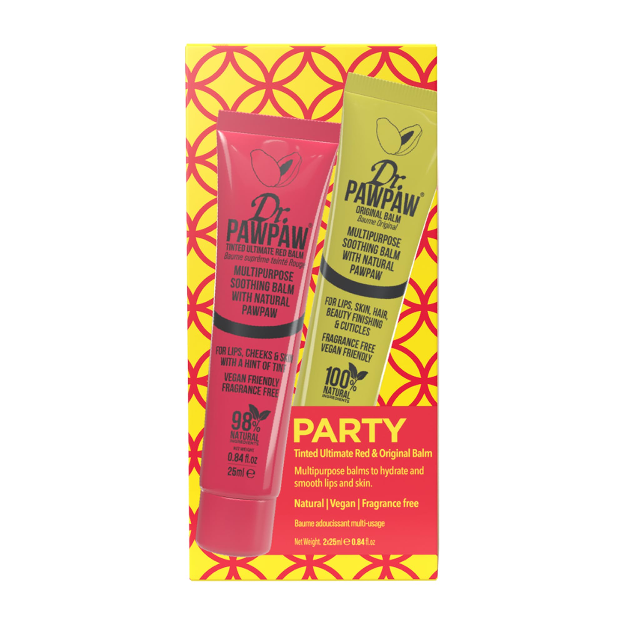 Introducing the Dr. PawPaw Party Set, which includes 0.84oz Multipurpose Soothing Tinted Balm - Ultimate Red and 0.84oz Multipurpose Soothing Original Balm, a collection of nourishing and hydrating lip care crafted with the finest natural ingredients. This multitasking set includes our signature formulas that are both nourishing and soothing. Each lip balm in this set is infused with the powerful benefits of antioxidant-rich pawpaw fruit, renowned for its ability to rejuvenate and revitalize the skin. Complemented by the calming properties of Aloe Vera and the deep moisturization provided by Olive Oil, our balms are an essential addition to your skincare routine. The Dr. PawPaw Party Set features a buildable and tinted balm that caters to all your lip care needs, whether you're seeking a subtle tint or a more vibrant hue. Our hydrating lip balm formulas are specifically designed to nourish dry lips, cracked lips and provide anti-aging lip care. These balms not only enhance the natural beauty of your lips but also provide a protective barrier against environmental stressors. Committed to inclusivity and ethical beauty, our products are suitable for all skin types and are meticulously crafted to be gluten-free, paraben-free, and cruelty-free. Additionally, this set is vegan, ensuring that you can enjoy luxurious lip care with a clear conscience.NATURAL LIP BALM SET: This lip balm gift set hydrates, protects, and rejuvenates with natural lip balm formulas enriched with Pawpaw Fruit, Aloe Vera, Olive and Castor Oil, ensuring hydrated skin without the greasy feeling. BUILDABLE TINT: Experience the versatility of our tinted balm, which offers buildable color while acting as a nourishing lip balm. Ideal for daily use, it enhances your natural lip color with a flawless finish. TINTED LIP BALM: The Tinted Red Lip Balm adds a versatile pop of color to lips, cheeks, and eyes. The buildable formula brings out your complexion instantly for effortless day-to-night beauty. MULTI-TASKING LIP BALM: The Original Balm is a nourishing, multi-tasking essential, ideal for hydrating lips, softening dry cuticles and skin. Its rich formula leaves hair, skin, and lips feeling soft, smooth, and soothed. MOISTURIZING AND NOURISHING: Our moisturizing lip balms provide intense hydration for dry lips, making it the ideal solution for dry skin. With nourishing pawpaw fruit, it revitalizes cracked lips, leaving them soft and supple.