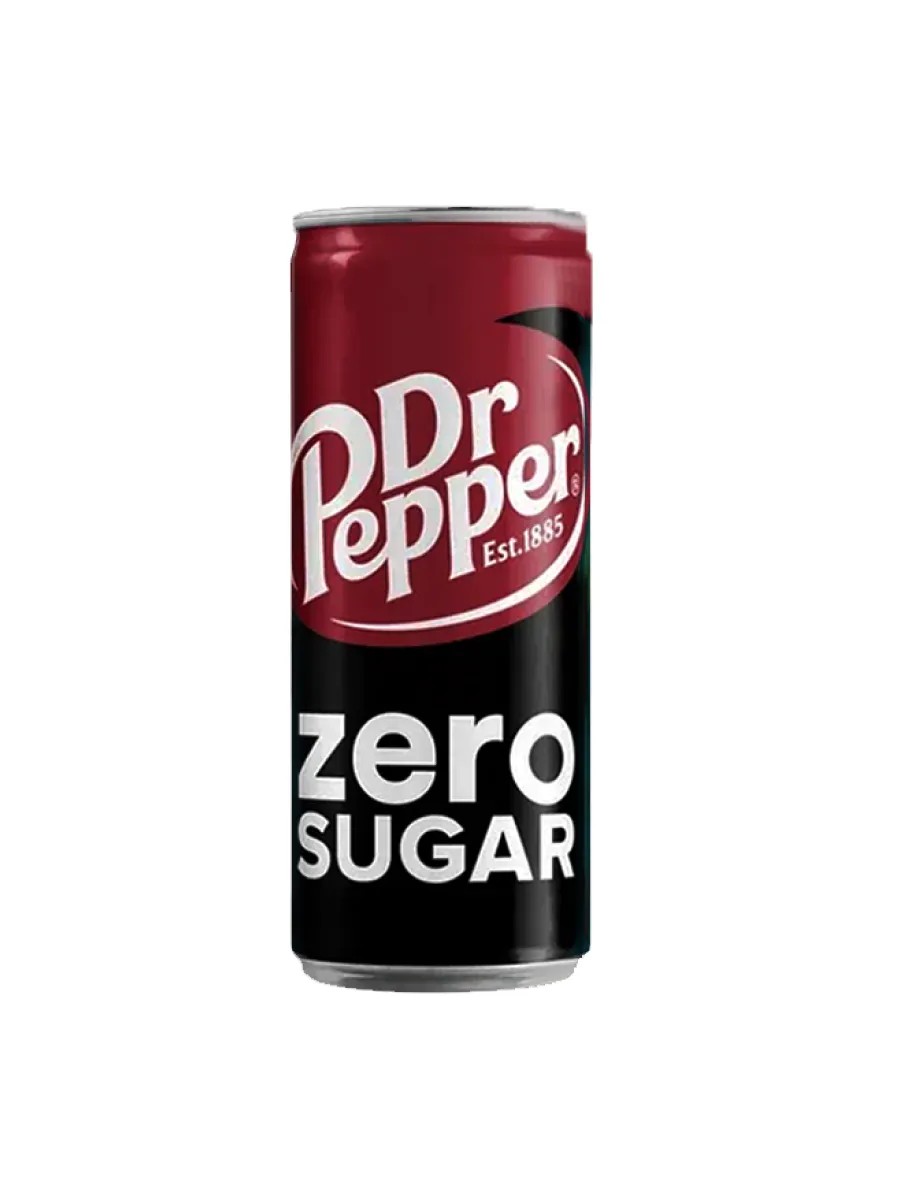 Dr. Pepper Zero, 330 ml. Dr. Pepper Zero, a highly carbonated drink, is a legendary refreshing cherry-flavored drink. No added sugar, reduced calorie. Ingredients: water, natural coloring, sugar coloring, acidity regulator phosphoric acid, sweeteners aspartame and acesulfame potassium. Nutritional value per 100 ml: 0.8 kcal/3.6 kJ, proteins 0 g, fats 0 g, carbohydrates 0.1 g. Storage conditions: store at room temperature, avoid direct sunlight. Shelf life: 9 months.