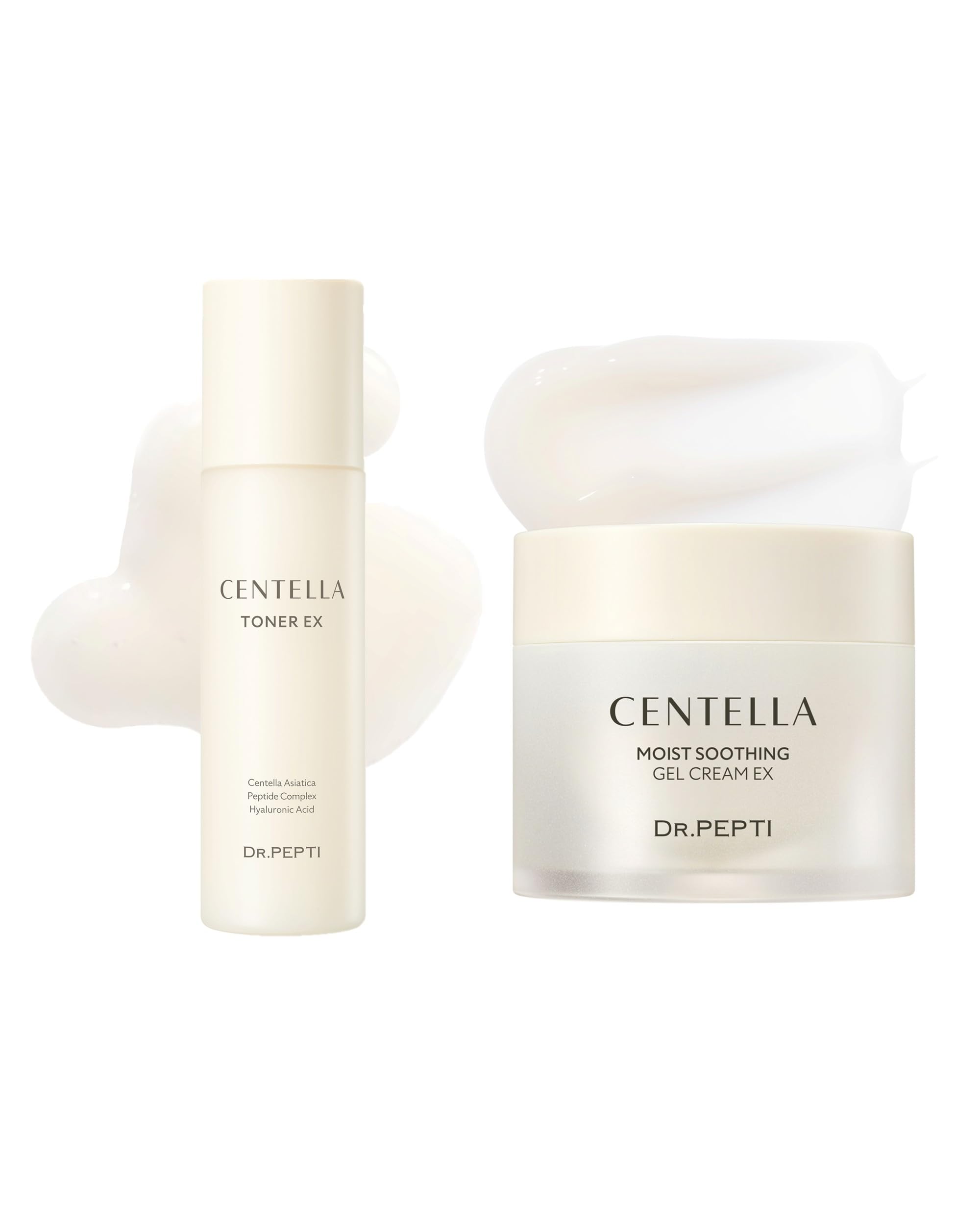 Experience the DR.PEPTI Centella skincare bundle featuring the Centella Toner EX and Centella Moist Soothing Gel Cream EX, a complete Korean hydration routine designed for dry and sensitive skin. The Centella Toner EX delivers 24-hour hydration with Centella Asiatica extract (1,353 ppm), Madecassoside (58.5 ppm), and Asiaticoside (16 ppm). Combined with 8 types of Hyaluronic Acid and 5 specialized peptides, this milky formula strengthens skin foundation and improves elasticity. Niacinamide, Shea Butter, Betaine, and Allantoin work synergistically to refine texture. The Centella Moist Soothing Gel Cream EX features revolutionary cooling technology clinically proven to reduce skin temperature by 5.3 C. With 72.5 Centella Asiatica extract (1,630 ppm) and 5,000 ppm of 5 types of Hyaluronic Acid, it provides instant relief for irritated skin. Aloe Barbadensis, Tea Tree Extract, Rosemary, Sage, and Peppermint deliver calming comfort. Together, this Centella-powered duo offers comprehensive soothing and hydration care.VERSATILE DAILY APPLICATION: Apply toner after cleansing, layer 3-4 times for intensive hydration. Follow with gel cream or apply thickly as overnight sleeping pack. Both formulas suit all sensitive skin types. BOTANICAL SOOTHING BLEND: Gel cream contains Aloe Barbadensis, Tea Tree Extract, Rosemary, Sage, and Peppermint, while toner includes Shea Butter, Betaine, and Allantoin for comfortable, non-sticky absorption. ADVANCED HYDRATION COMPLEXES: Toner features 8 types of Hyaluronic Acid with 5 peptides and Niacinamide, while gel cream contains 5,000 ppm of 5 Hyaluronic Acid types plus TECA components for optimal moisture. REVOLUTIONARY COOLING TECHNOLOGY: Gel cream is clinically proven to reduce skin temperature by 5.3 C with 72.5 Centella Asiatica extract (1,630 ppm), while toner delivers 24-hour hydration with 1,353 ppm concentration. COMPLETE KOREAN CENTELLA DUO: This DR.PEPTI bundle pairs Centella Toner EX (6.09 fl.oz.) with Centella Moist Soothing Gel Cream EX (2.37 fl.oz.) for comprehensive soothing and hydration care for sensitive skin.