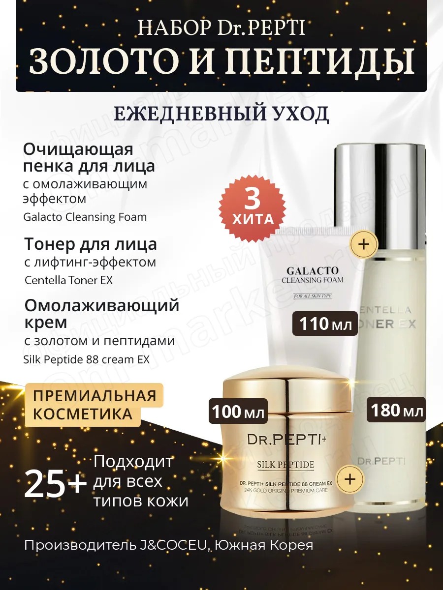 1) Очищающая пенка для лица с омолаживающим эффектом Galacto Cleansing Foam обеспечивает идеальное очищение кожи. Обладает потрясающим восстанавливающим эффектом. Уникальный продукт для очищения кожи любого типа! Способ применения: Влажными руками вспенить небольшое количество средства. Получившуюся пенку нанести на влажное лицо и шею. Помассировать. Смыть теплой водой.2) Тонер для лица с лифтинг-эффектом Centella Toner потрясающее средство для круглосуточного увлажнения кожи и анти возрастного ухода. Средство нового поколения от корейского производителя J&Coceu из линии по уходу за кожей Dr.Pepti+. Centella Toner - это не просто "доочищение" кожи, это потрясающее средство для круглосуточного увлажнения кожи, это антивозрастной уход и проводник для последующих косметических продуктов. Выравнивает тон кожи, борется с морщинами, нежно отшелушивает ороговевшие клетки кожи, сужает поры. Активные ингредиенты в высокой концентрации.Способ применения: После умывания нанести достаточное количество тонера на ватный диск или на кончики пальцев и распределить легкими движениями по коже лица, шеи и декольте. Использовать каждый раз после умывания! Утром и вечером.3) Крем омолаживающий Silk Peptide 88 cream EX антивозрастной эликсир, обогащенный витаминами и наночастицами золота, эффективно борется с морщинами, делает кожу эластичной и упругой. Пептиды шелка за счет своей низкомолекулярной структуры обладают высокой проницаемостью и запускают ряд биохимических реакций, направленных на восстановление клеток кожи. Пептиды шелка богаты аминокислотами и олигопептидами, необходимыми для обменных процессов. В результате улучшаются микроциркуляция, лимфоток, структура кожи, а также разглаживаются морщины и восстанавливается здоровый цвет лица. Аминокислоты мгновенно заполняют все повреждения и неровности на коже, возвращая ей гладкость и мягкость. Крем предназначен для всех типов кожи. Способ применения: Используйте на последнем этапе ухода за кожей. Наносите по всему лицу и мягко вмассируйте по массажным линиям.