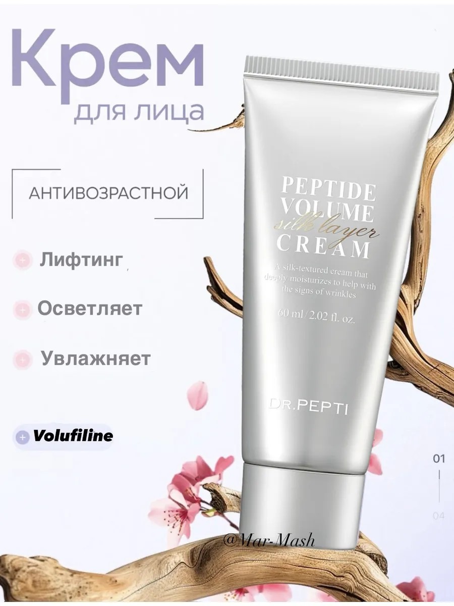 Крем для упругости кожи с пептидами против морщин Dr.Pepti Peptide Volume Silk Layer Cream глубоко увлажняет кожу, осветляет пигментные пятна, обладает шелковой текстурой и концентрированным составом, который включает в себя 4 вида самых лучших пептидов, которые повышают эластичность и упругость кожи, такие как гиалуроновая кислота, бета-глюкан, экстракты азиатских трав. Премиальный крем содержит комплекс пептидов, среди которых сигнальные пептиды, миорелаксанты и пептиды с противовоспалительным и осветляющим действием. Пептиды запускают выработку коллагена и гиалуроновой кислоты, противостоят разрушению коллагеновых волокон, укрепляют внеклеточный матрикс. За счёт этого пептидный комплекс сокращает выраженность морщин и заломов, уменьшает признаки возрастных изменений и фотостарения, делает кожу более молодой. Профессиональная сыворотка имеет в составе запатентованный ингредиент Cedar Massa придающий коже жизненную силу, здоровое сияние и энергию. Увлажняющий крем для лица Корея обеспечивает длительное питание, способствует заметному сокращению морщин, заживление несовершенств, нормализует водно-жировой баланс кожи, повышает тонус, эластичность и гладкость кожи. Этот высокоэффективный 24-часовой уход за лицом был специально разработан для нужд зрелой кожи, потерявшей эластичность и объем. Продукт основан на запатентованном активном ингредиенте Volufiline, полученном из корней азиатского растения. Крем Хит 2025 глубоко увлажняет кожу, осветляет пигментные пятна, обладает шелковой текстурой. Благодаря ежедневному применению,