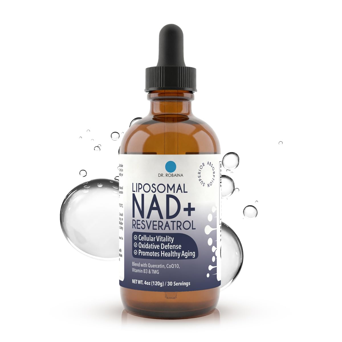 Dr. Robaina Liposomal NAD+ Drops with Resveratrol and CoQ10 to support cellular energy and focus.