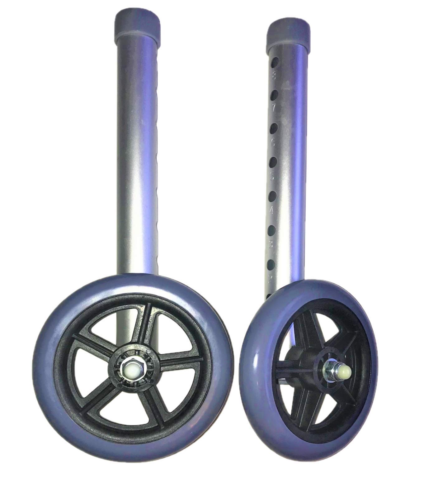 Walker Wheels, Replacement Feet walker, Tall Extension Legs with 5" wheel, Walker Accessories Parts Set, 1 PairRubber wheel allows to roll easily and smoothly over irregular surfaces. Net weight 260 gr Total height 12.5" 32 cm. Tube diameter 1" 2.5 cm,. Caster Diameter: 5" 12.8 cm. Hight adjustment. 8x1 inch.