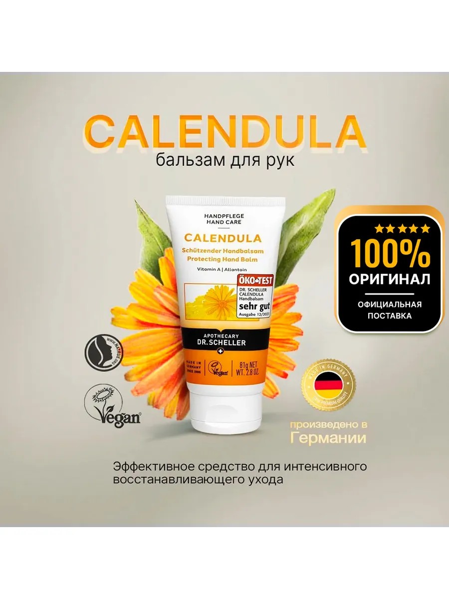 Dr. Scheller Доктор Шеллер Бальзам для рук Календула, 75 мл. Бальзам увлажняющий питательный крем для рук Календула- эффективное натуральное средство для интенсивного восстанавливающего ухода за обветренной, шершавой кожей рук или ног содержит успокаивающий экстракт календулы. Питательный крем для рук и ног легко впитывается, быстро улучшает состояние кожи рук, делая её более мягкой и эластичной. Средство по уходу за кожей ускоряет заживление трещин и других мелких повреждений благодаря тонизирующему витамину А, противовоспалительному действию календулы и омолаживающему клетки аллантоину. Крем бальзамический используется для питания сухой, потрескавшейся кожи на локтях, на стопах, пятках. Экстракт календулы оказывает защитное, регенерирующее, успокаивающее и противовоспалительное действие. Без глютена и лактозы, не содержит минеральных масел, парабенов, силиконов, сульфатов, ацетона, искусственных консервантов и красителей.Dr. Scheller (Германия) – один из пионеров современной натуральной косметики. Специалисты марки одними из первых выпустили на рынок линии минеральной и ароматерапевтической косметики, средства с антиоксидантами, а также бьюти-нутрицевтики. Качество продукции "Доктор Шеллер" (Dr. Scheller) подтверждается экосертификатом BDIH.Крема бальзамы для кожи рук экстракт календула немецкое качество премиум от dr scheller! Питательный органический заживляющий антивозрастной защитный натуральный бальзам от сухости для обветренной кожи доктор Шеллер дарит профессиональный уход для чувствительной и очень сухой кожи. Заживляющий маленький крем мини. Женский мужской детский для беременных. Дерматологически тестировано. Защита и интенсивный уход. Смягчающий бальзам dr. scheller придает коже ощущение мягкости и эластичности легко впитывается и улучшает кожу рук. Подтягивающий регенерирующий омолаживающий восстанавливающий лифтинг воск эффект. Содержит аллантоин. Ускоряет смягчение и заживление. Без силиконов минеральных масел парабенов и синтетических красителей.