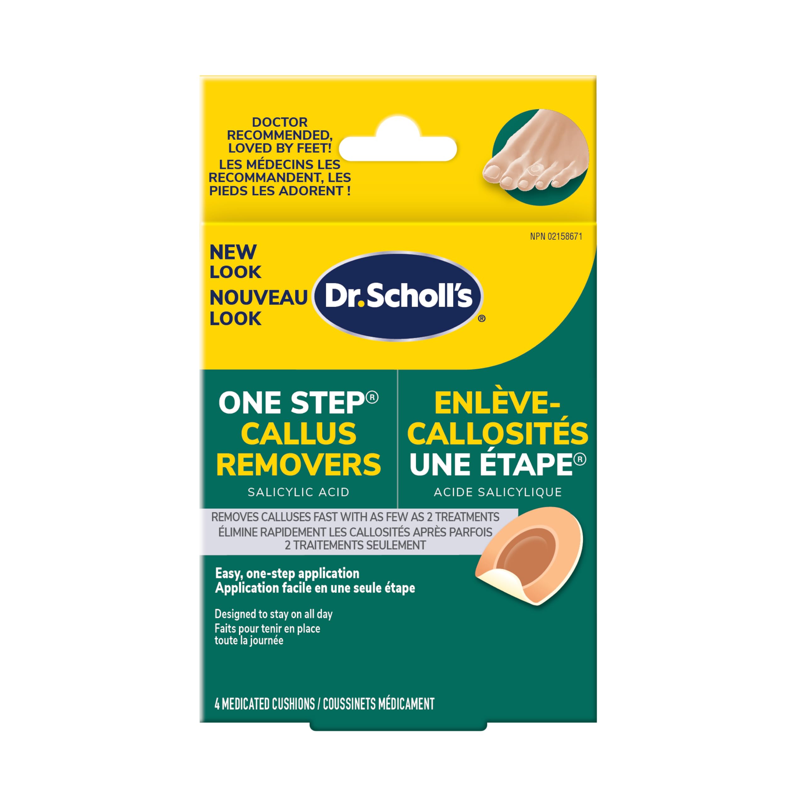 Dr. Scholl's One Step Callus Removers is medicated. Its patented formula contains salicylic acid USP 40 w w and removes calluses effectively. It provides immediate cushioning and pain relief from shoe pressure.Package Dimensions: 14.986 L x 2.032 H x 9.906 W (centimeters). Available product: 4 Medicated Cushions. The medicated disk removes callus while cushion relieves pain due to shoe pressure. It's an easy, one-step application, with no need to apply medicated disk and cushion separately.