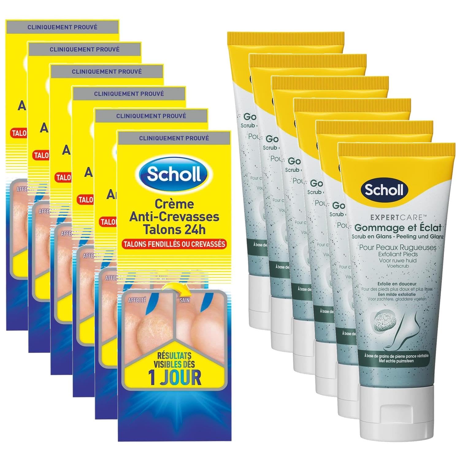 THIS SET CONTAINS 2 Foot Creams: a 60ml Anti-Cracked Heel Cream and a 75ml Scrub. Use the Scrub Cream in conjunction with the Anti-Cracked Heel Cream for optimal results. ANTI-CRACKED HEEL CREAM - Scholl's 24-hour Anti-Cracked Heel Cream soothes dry, cracked, fissured, or damaged skin on the heels. It contains keratin, which promotes the natural renewal process of dry skin. SCRUB CREAM - The scrub cream effectively removes dead skin to leave your feet soft. Thanks to this cream, rough and dry areas gradually become smoother. REMEDY FOR DRY FEET AND CRACKED HEELS - From the first use, dry skin is softened, and feet are less rough and white due to dryness. Regular use of both products helps prevent the recurrence of cracks and calluses and keeps skin smooth, moisturized, and protected. SCHOLL QUALITY - Show your feet how much you love them by using Scholl products specially designed to care for your feet. Discover creams, masks, foot files, and the Scholl insole range to suit different lifestyles. "Why choose Scholl? With over 100 years of expertise, Scholl is a leader in foot comfort. Today, we remain true to the values of our founder, Dr. William Mathias Scholl, values we implement with passion and dedication. All Scholl products are specially designed to make every step a pleasure - our ambition is to improve everyone's health, comfort, and well-being by caring for your feet. Scholl takes care of your feet with foot files, foot creams, insoles, and other products to treat foot conditions."SCHOLL QUALITY - Show your feet how much you love them by using Scholl products specially designed to care for your feet. Discover creams, masks, foot files, and the Scholl insole range to suit different lifestyles. REMEDY FOR DRY FEET AND CRACKED HEELS - From the first use, dry skin is softened, and feet are less rough and white due to dryness. Regular use of both products helps prevent the reappearance of cracks and calluses and keeps skin smooth, moisturized, and protected. EXFOLIATING CREAM - The Exfoliating Cream effectively removes dead skin to leave your feet soft. Thanks to this cream, rough and dry areas gradually become smoother. ANTI-CRACK CREAM - Scholl's 24-Hour Anti-Crack Heel Cream soothes dry, cracked, fissured, or damaged skin on heels. It contains keratin, which promotes the natural renewal process of dry skin. THIS SET CONTAINS 2 Foot Creams: a 60ml Anti-Cracked Heel Cream and a 75ml Scrub. Use the Scrub Cream in conjunction with the Anti-Cracked Heel Cream for optimal results.SCHOLL Pack contenant 1 Crème Anti-Crevasses Talons 60ml 1 Crème Pieds Gommage 75ml - Lot de 6 packsDESCRIPTION DU PRODUIT CE LOT CONTIENT 2 Crèmes Pieds dont une Anti-Crevasses Talons 60ml et une Gommage 75ml. Utiliser la Crème Gommage en complémentarité de la Crème Anti-Crevasses pour des résultats optimaux CREME ANTI-CREVASSE - La Crème Anti-Crevasses Talons 24h de Scholl soulage la peau sèche, fendillée, fissurée ou abîmée des talons. Elle contient de la kératine, qui favorise le processus naturel de renouvellement des peaux sèches CREME GOMMAGE - La Crème gommante est efficace dans l'élimination des peaux mortes pour rendre vos pieds doux. Grâce à cette crème les zones rugueuses et sèches s'affinent progressivement REMEDE PIEDS SECS ET TALONS FENDILLES - Dès la première utilisation, la peau sèche est adoucie et les pieds sont moins rugueux et blancs dûs à la sécheresse. L'usage régulier des deux produits aide a prévenir la réapparition des crevasses et callosités et maintient la peau lisse, hydratée et protégée QUALITE SCHOLL - Montrez à vos pieds à quel point vous les aimez en utilisant les produits Scholl spécialement conçus pour prendre soin de vos pieds. Découvrez les crèmes, les masques, les râpes ainsi que la gamme semelle de Scholl correspondant à différents style de vie "Pourquoi choisir Scholl ? Avec plus de 100 ans d'expertise, Scholl est un incontournable dans le réconfort des pieds. Aujourd'hui encore, nous continuons d'être fidèle aux valeurs de notre fondateur Dr. William Mathias Scholl, valeur que nous mettons en œuvre avec passion et dévouement. Tous les produits Scholl sont spécialement conçus afin que chaque pas soit un plaisir - notre ambition est d'améliorer la santé, le confort et le bien-être de chacun en prenant soin de vos pieds. Scholl s'occupe de vos pieds avec les râpes, crèmes pour pieds, semelles, et autres produits pour soigner les pathologies. "QUALITE SCHOLL - Montrez à vos pieds à quel point vous les aimez en utilisant les produits Scholl spécialement conçus pour prendre soin de vos pieds. Découvrez les crèmes, les masques, les râpes ainsi que la gamme semelle de Scholl correspondant à différents style de vie. REMEDE PIEDS SECS ET TALONS FENDILLES - Dès la première utilisation, la peau sèche est adoucie et les pieds sont moins rugueux et blancs dûs à la sécheresse. L'usage régulier des deux produits aide a prévenir la réapparition des crevasses et callosités et maintient la peau lisse, hydratée et protégée. CREME GOMMAGE - La Crème gommante est efficace dans l'élimination des peaux mortes pour rendre vos pieds doux. Grâce à cette crème les zones rugueuses et sèches s'affinent progressivement. CREME ANTI-CREVASSE - La Crème Anti-Crevasses Talons 24h de Scholl soulage la peau sèche, fendillée, fissurée ou abîmée des talons. Elle contient de la kératine, qui favorise le processus naturel de renouvellement des peaux sèches. CE LOT CONTIENT 2 Crèmes Pieds dont une Anti-Crevasses Talons 60ml et une Gommage 75ml. Utiliser la Crème Gommage en complémentarité de la Crème Anti-Crevasses pour des résultats optimaux.
