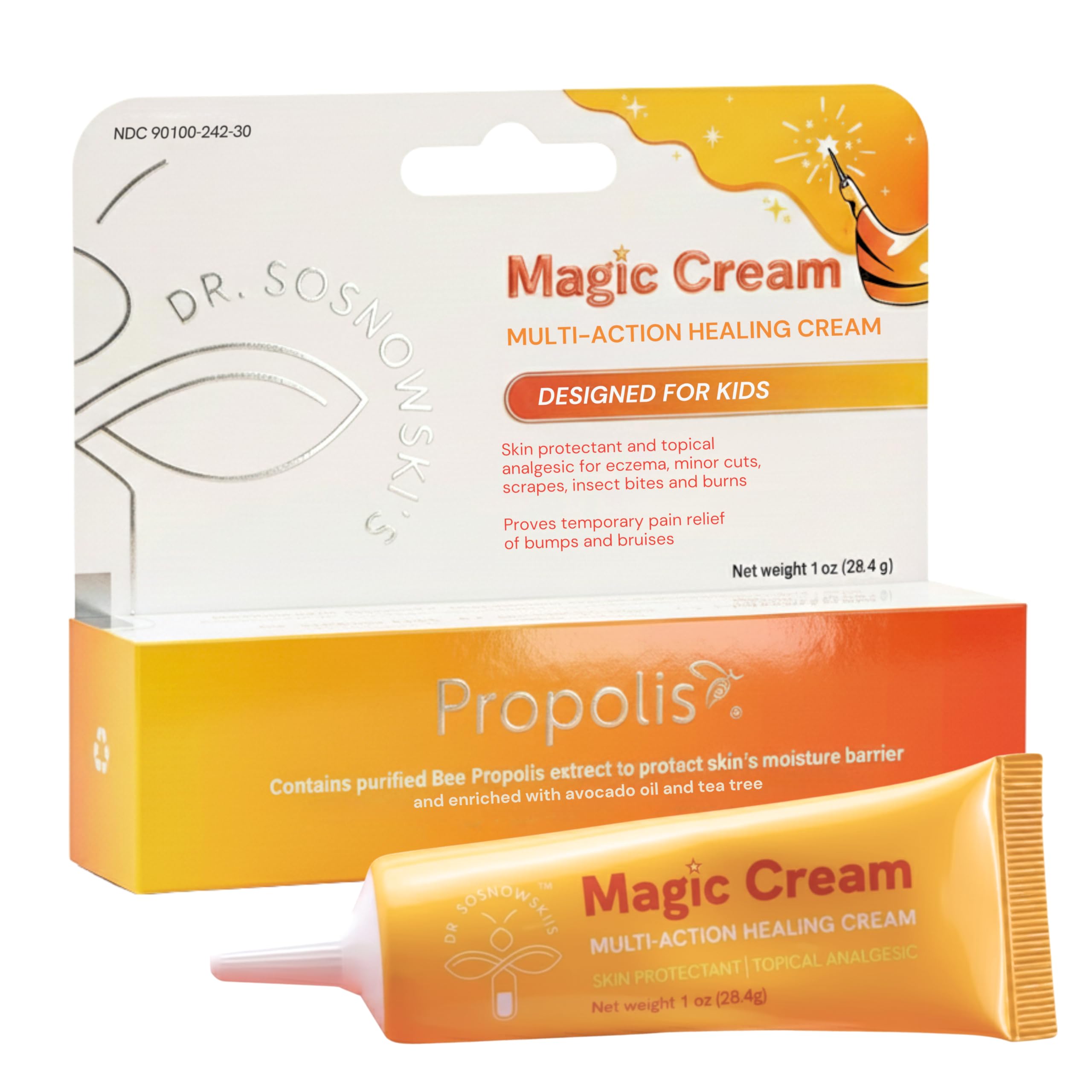 WHO WAS DR. SOSNOWSKI? - Dr. Sosnowski spent 35 years studying bee propolis and developed patented techniques to unlock its powerful properties long before modern science began taking propolis seriously. We use his original techniques and testing methods in every tube of Magic Cream - multi-action healing ointment. PROPOLIS - Made up of hundreds of beneficial compounds, bee propolis keeps the beehive resilient and free from disease. In Magic Cream, propolis acts as an antioxidant and vitamin-rich ingredient that supports nourished skin and is ideal for use on children's minor skin issues. BACKED BY SCIENCE – 2-in-1 formula targets source of discomfort and surface damage – providing pain and itching relief of eczema as well as skin barrier protection in one. Powered by a dual FDA-monograph combining colloidal oatmeal (skin protectant) and camphor (topical analgesic) and enriched with natural and science-backed ingredients. MADE FOR KIDS, WORKS FOR WHOLE FAMILY - Magic Cream is formulated specifically for children's skin, delivering care and relief from kids eczema and other skin irritations without steroids, antibiotics or artificial fragrances. But there's no need to stockpile separate creams for adults – it's just as effective on the whole family!. MULTI-ACTION MAGIC – Function-first, smarter skincare that embraces modern science and powerful natural ingredients. Effective on cuts and scrapes, eczema rash, minor burns, insect bites, bruises, bumps and more. LET'S PUT SOME MAGIC CREAM ON IT' – Streamline your cabinet of single-use creams with a multi-action solution for 8 common skincare needs including eczema.