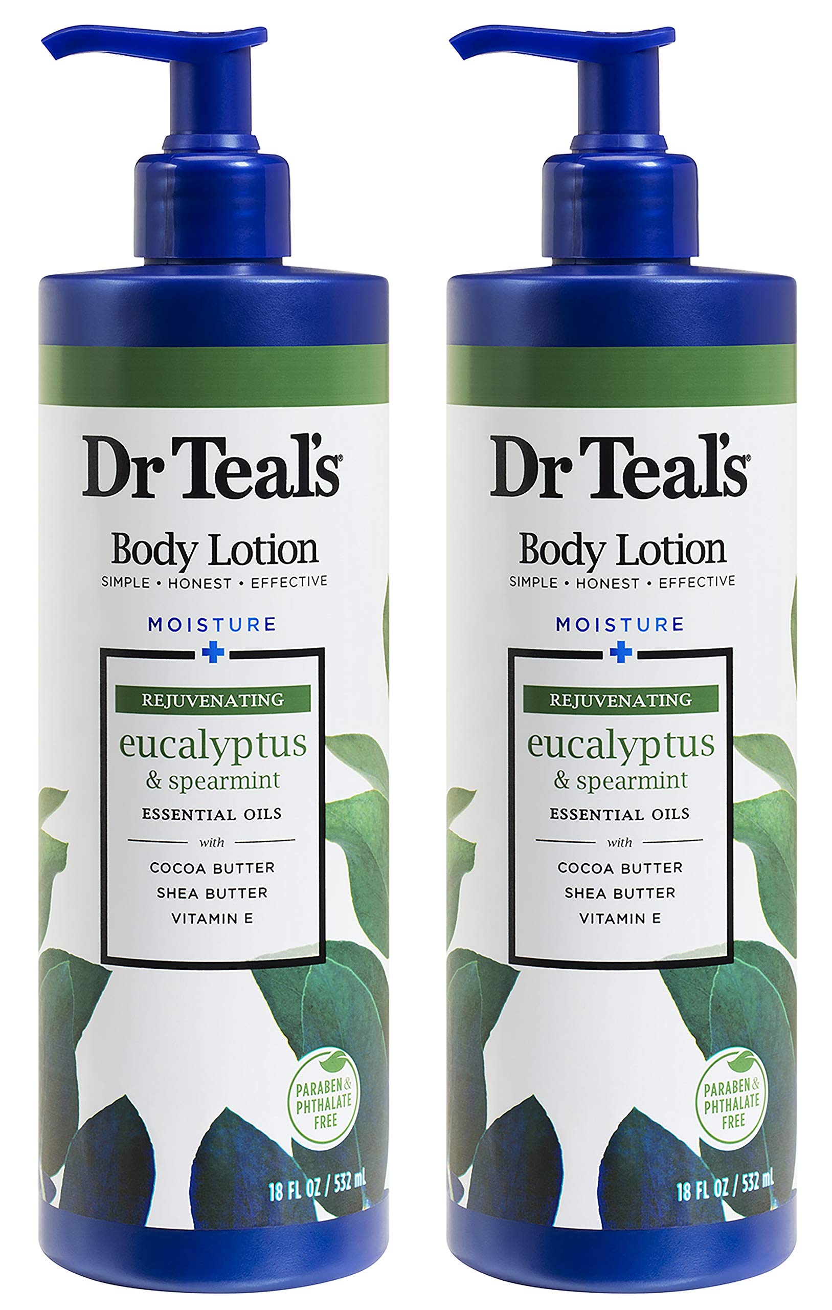 Use Dr. Teal's Moisture Plus Rejuvenating Eucalyptus Spearmint Essential Oils Body Lotion to keep your skin moisturized and healthy. This blend of Shea Butter, Cocoa Butter, and Vitamin E along with Eucalyptus Spearmint helps to refresh, soften, and protect skin. Use daily to restore, nourish, and promote healthier looking skin. Paraben and phthalate free. Dermatologist tested. 2-pack of 18 Fl Oz pump bottles for a total of 36 Fl Oz.