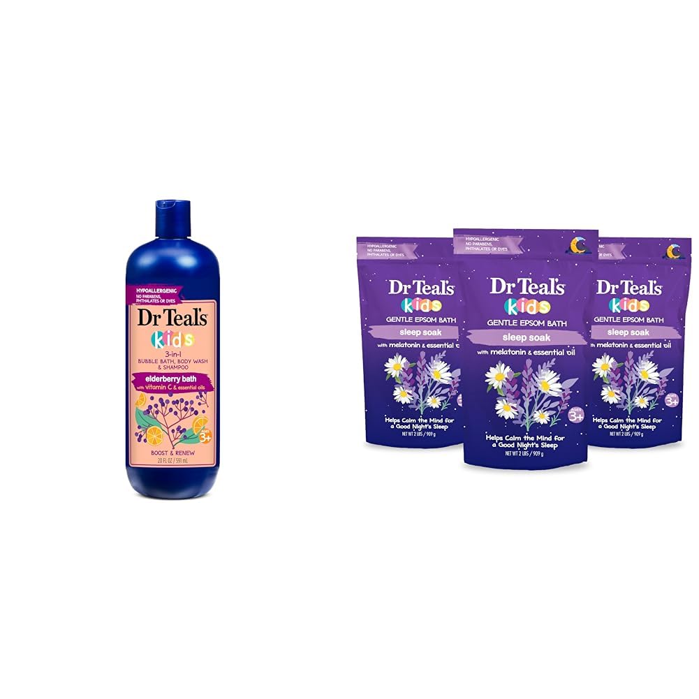 Dr Teal's Kids 3-in-1 Elderberry Bath: Bubble Bath, Body Wash Shampoo, 20 fl oz. Bath time is fun for kids and easier for parents with Dr Teal's Kids 3-in-1 Elderberry Bath: Bubble Bath, Body Wash Shampoo. Specially formulated to be safe and hypoallergenic, Dr Teal's Kids 3-in-1 is made with gentle cleansers that make incredible bubbles for a great smelling bubble bath. It also works great as a shampoo and body wash. Elderberry and Vitamin C are combined with natural essential oils to help boost renew. Dr Teal's Kids 3-in-1 Elderberry Bath: Bubble Bath, Body Wash Shampoo is paraben-free, phthalate-free, cruelty-free, and vegan. Dr Teal's Kids Gentle Epsom Salt, Sleep Soak with Melatonin Essential Oil Blend, 2 lbs (Pack of 3) Treat your kids to a relaxing bath with Dr Teal's Kids Gentle Epsom Salt, Sleep Soak with Melatonin Essential Oil Blend. Our hypoallergenic formula combines Pure Epsom Salt, known for its ability to soothe skin and growing bodies, with a blend of melatonin and essential oils to help calm the mind for a good night's sleep. Nourishing coconut oil helps nourish and rejuvenate their skin. Add our soak to the bath to help your kids relax and wind down. Dr Teal's Kids Gentle Epsom Salt, Sleep Soak with Melatonin Essential Oil Blend is paraben-free, phthalate-free, cruelty-free, and vegan.