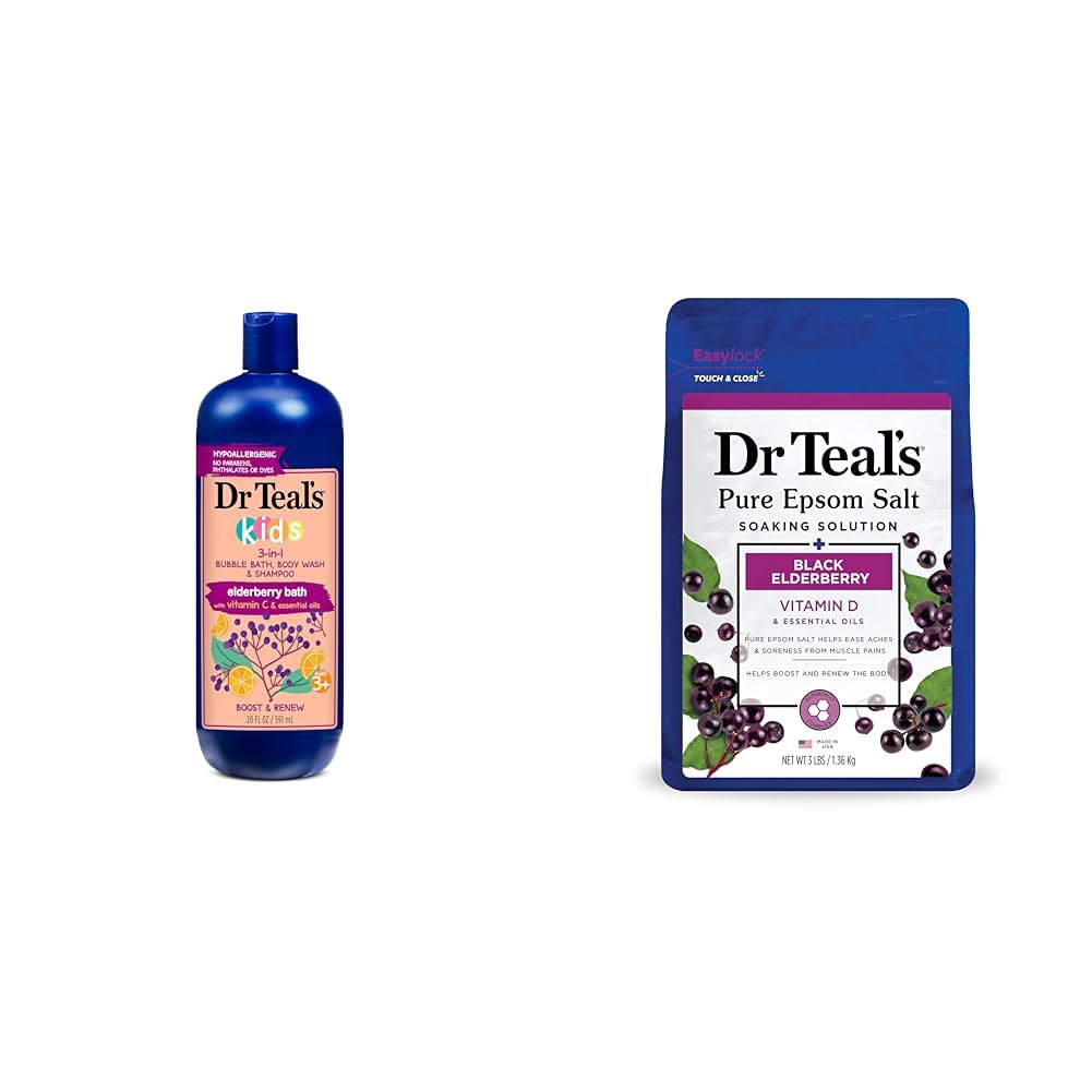 Dr Teal's Kids 3 in 1 Elderberry Bubble Bath, Body Wash Shampoo with Vitamin C Essential Oils 20 fl oz (Packaging May Vary) B08SCS7PLS Dr Teal's Pure Epsom Salt Soak, Black Elderberry with Vitamin D, 3 lbs (Packaging May Vary) Soak in Dr Teal's Black Elderberry with Vitamin D Pure Epsom Salt for a calming, renewing bath. Pure Epsom Salt helps to ease aches and soreness from muscle pains while refreshing skin's appearance and antioxidant-rich black elderberry and vitamin D help to renew skin while lemon and sage essential oils uplift your mood. Dr Teal's products are infused with essential oils to relax, replenish and rejuvenate your mind and body. Take a moment for yourself tonight so you can feel your best tomorrow.