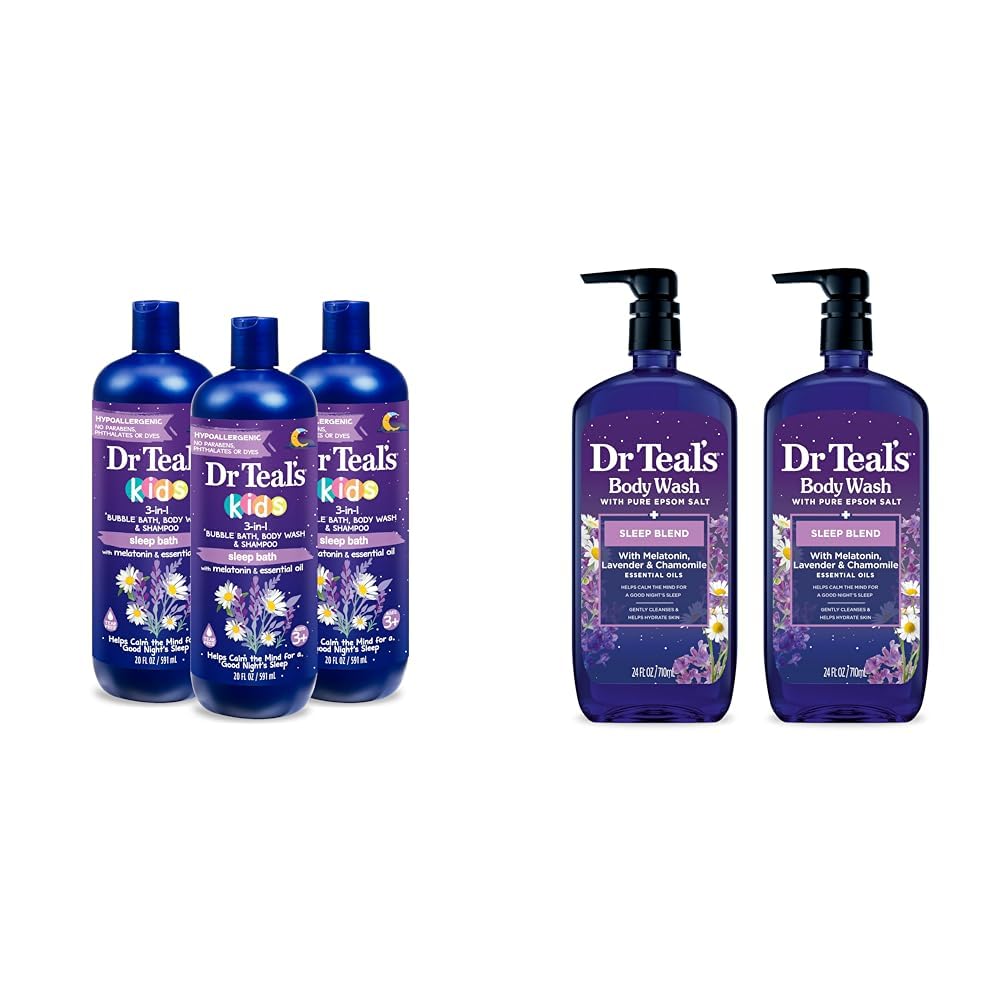 This bundle pairs Dr Teal's Kids 3-in-1 Sleep Bath (20 fl oz, pack of 3) with Dr Teal's Sleep Blend Body Wash (24 fl oz, pack of 2) to help the entire family relax and unwind before bedtime. The kids bath option is a gentle, hypoallergenic formula made with melatonin and essential oils to calm young minds after a busy day. It makes lush bubbles for bubble baths and also works as a body wash and shampoo. The adult body wash features a sleep-promoting blend of melatonin, lavender and chamomile essential oils to soothe the mind. It also contains skin-nourishing shea butter, aloe, vitamin E and pure Epsom salt to cleanse, exfoliate and deeply hydrate. Together, these cruelty-free, vegan products create a soothing self-care routine for parents and kids. Unwind in relaxing bubbles or showers infused with aromatherapeutic essential oils. The calming formulas help everyone wind down at the end of the day for a good night's sleep.