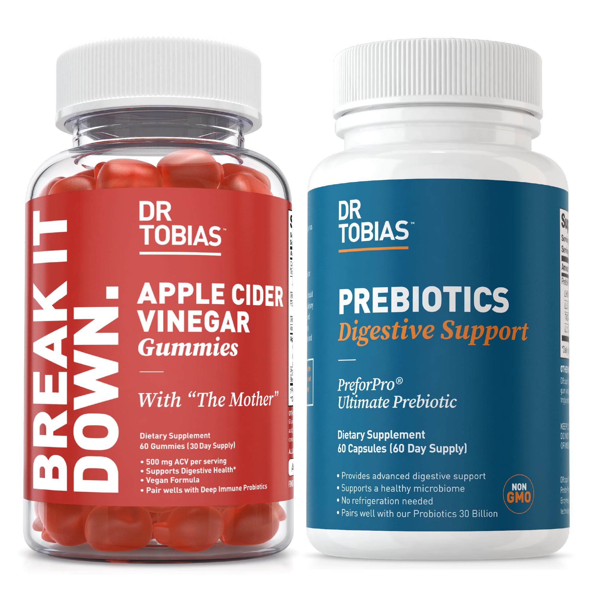 A Better You Starts Here: We stand behind our products, source only the highest quality ingredients, and care about our customers. Whether you're looking for a cleanse, detox, energy boost or overall health support our trusted formulas are here to help. Professionally Formulated:All Dr. Tobias Nutritional supplements are developed by vitamin experts in our innovative, GMP certified facility in the USA and formulated with carefully selected domestic globally sourced ingredients. The highest standard guaranteed. Dr. Tobias Prebiotics: Our PreforPro technology nourishes beneficial gut flora to support the digestive process and help activate gut immune function, forming an essential foundation for a healthy microbiome and improved nutrient absorption. Non-GMO, Vegan, 60 Capsules, 60 Servings. Apple Cider Vinegar Gummies: Our ACV Gummies provide 500mg of ACV with the Mother per gummy, enhanced with Folate and B12. These gummies support digestion and curb cravings, providing all the benefits of ACV without the strong liquid taste. Vegan, Gluten-free, 60 Gummies, 60 Servings. Promote a Balanced Gut Microbiome: Optimize your digestive health with Apple Cider Vinegar Gummies and Dr. Tobias Prebiotics. This combination supports daily digestion, curbs cravings, and nourishes beneficial gut flora, creating a foundation for a balanced microbiome and improved nutrient absorption.