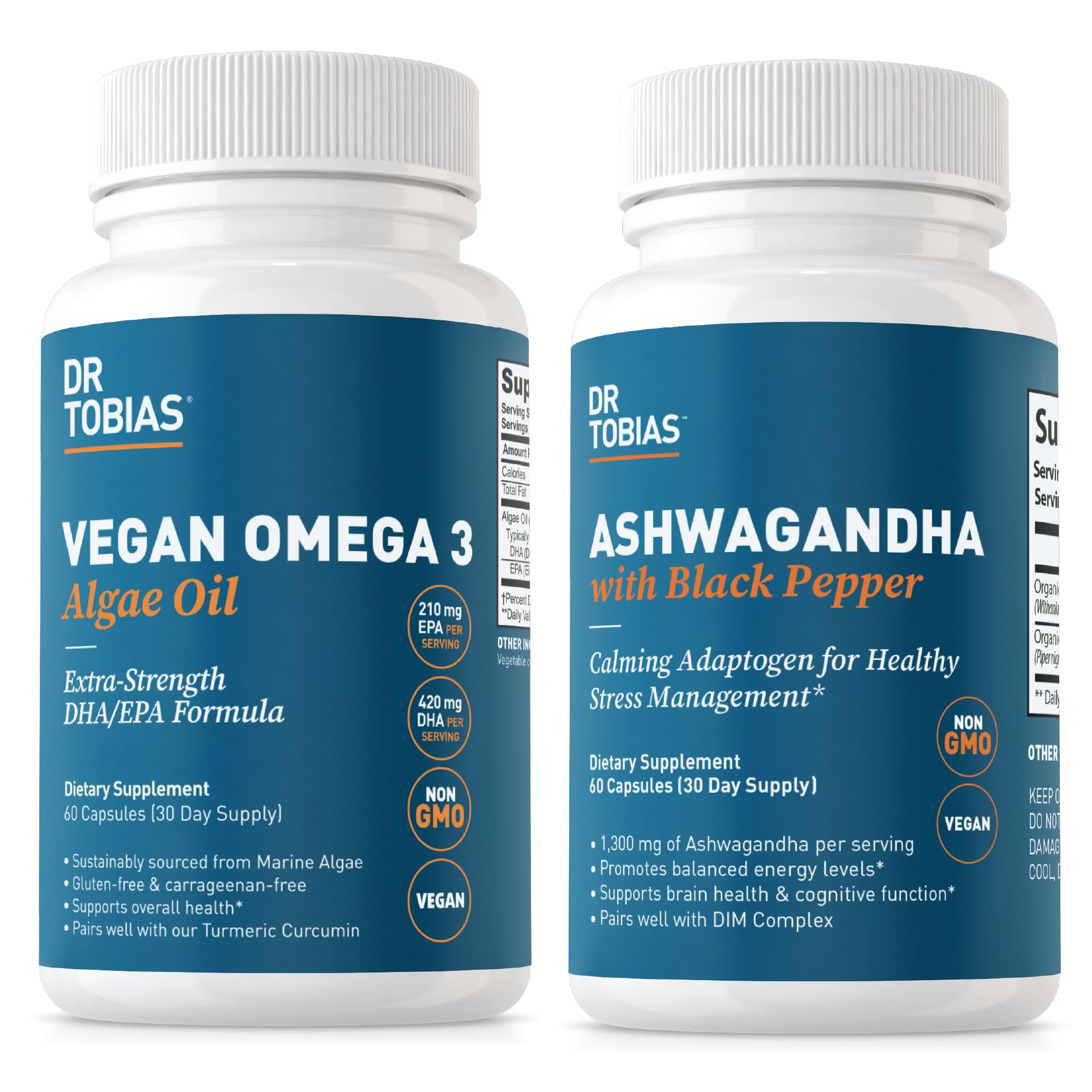 A Better You Starts Here: We stand behind our products, source only the highest quality ingredients, and care about our customers. Whether you're looking for omega 3s, a joint support supplement, brain, heart, or immune boost, our trusted formulas are here to support your vitality wellness goals. Professionally Formulated: All Dr. Tobias nutritional supplements are developed by vitamin experts in our innovative, GMP certified facility in the USA and formulated with carefully selected domestic globally sourced ingredients. The highest standard guaranteed. Calming Adaptogen Formula: Dr. Tobias Ashwagandha Capsules contain 1300mg of Organic Ashwagandha root extract enhanced with Black Pepper for improved absorption, supporting balanced and sustained energy levels. Non-GMO, Vegan, 60 Capsules, 30 Servings. High-Potency Vegan Omega 3: Dr. Tobias Vegan Omega 3 Algae Oil delivers a concentrated dose of DHA EPA from sustainable marine algae. Each serving provides 420mg DHA and 210mg EPA to support circulatory wellness, cognitive function, eye health, and immune response. Non-GMO, Gluten-Free, Vegan. 60 Capsules, 30 Servings. Promote Resilience and Inner Balance: Pairing Vegan Omega 3 with Ashwagandha offers a potent combination for cognitive balance, readiness and resilience to support your overall health and well-being.